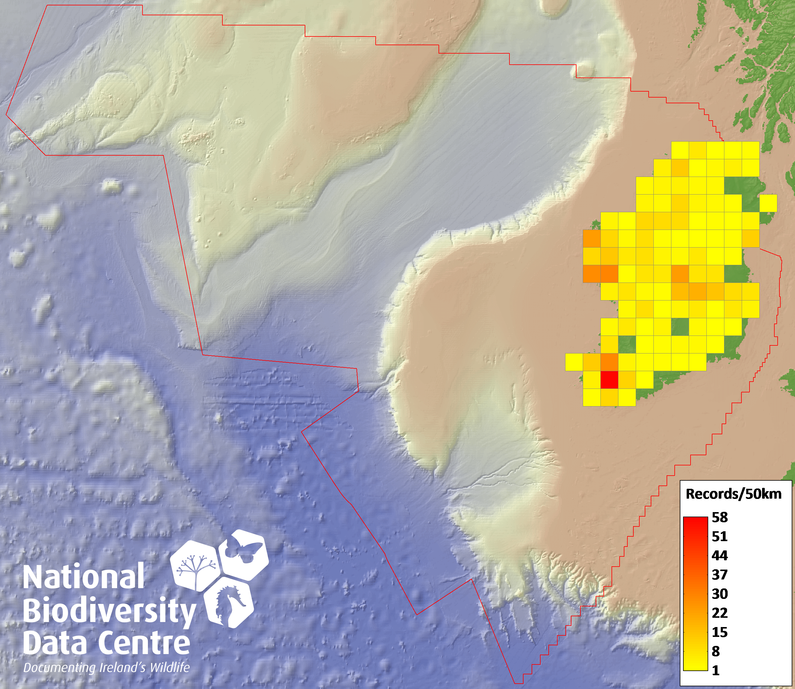 Distribution of the number of records recorded within each 10km grid square (ITM).Marine Map - 50km