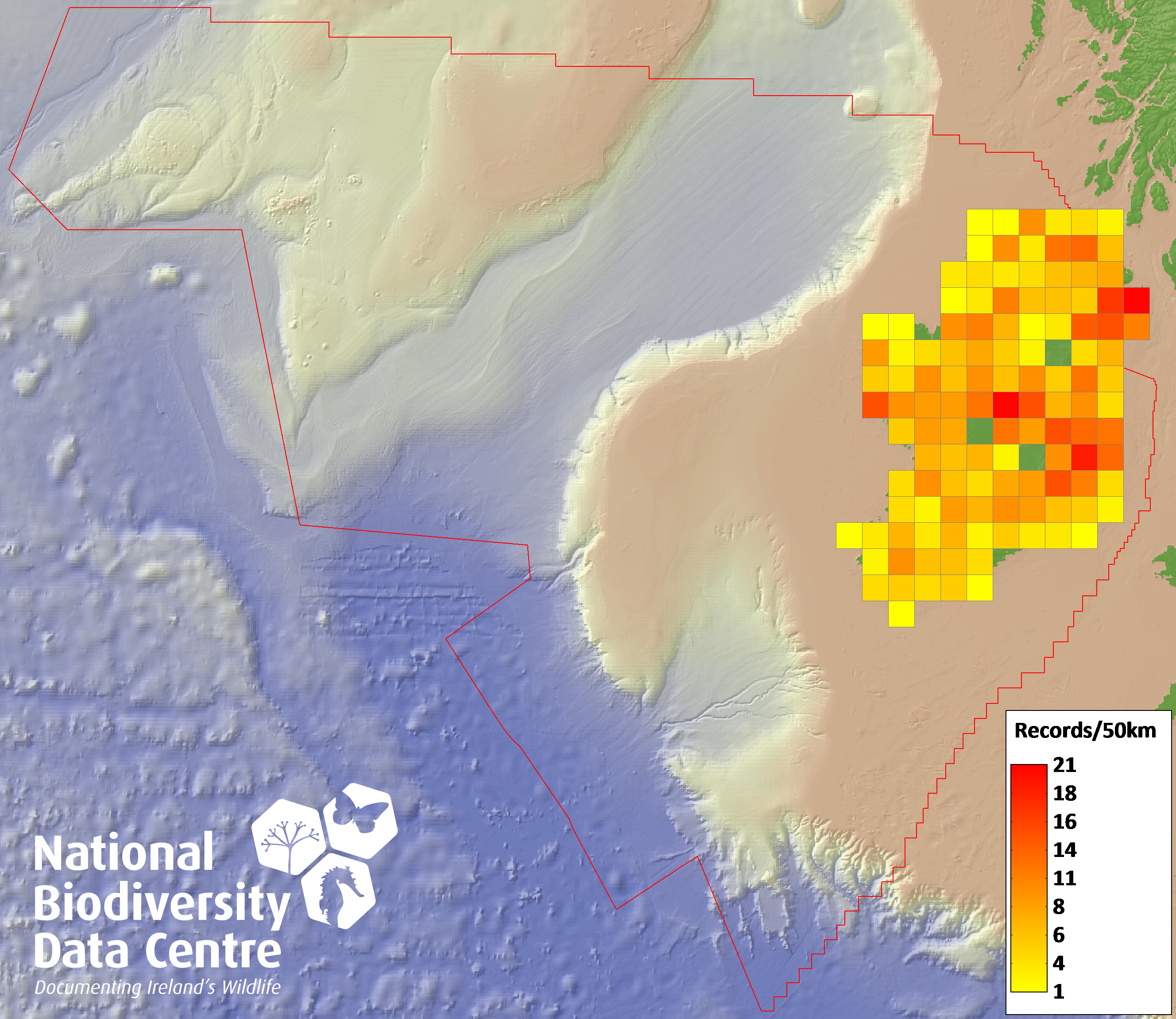 Distribution of the number of records recorded within each 10km grid square (ITM).Marine Map - 50km