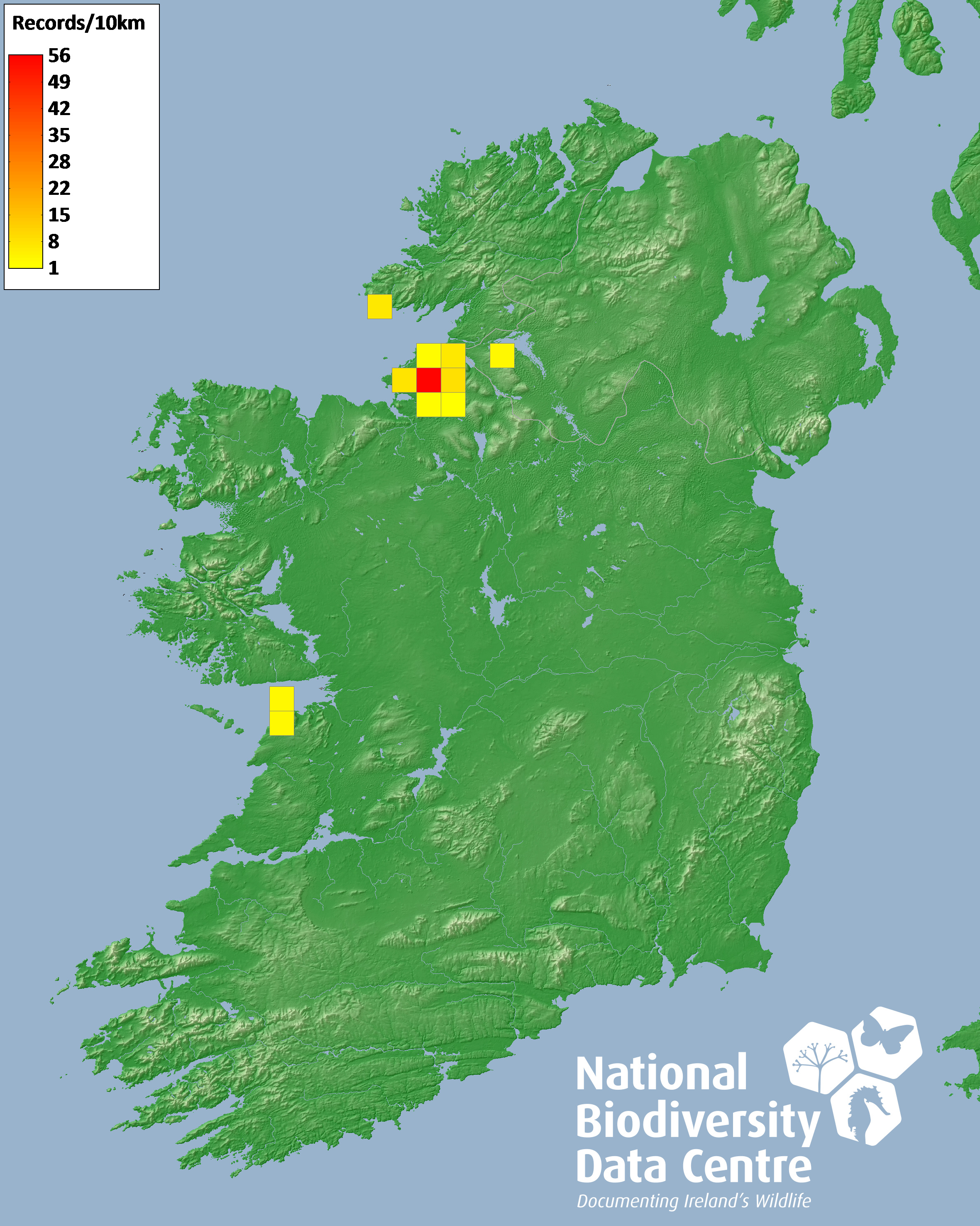 Distribution of the number of records recorded within each 10km grid square (ITM).Marine Map - 50km