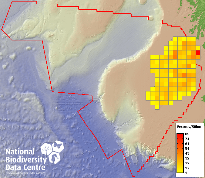 Distribution of the number of records recorded within each 10km grid square (ITM).Marine Map - 50km