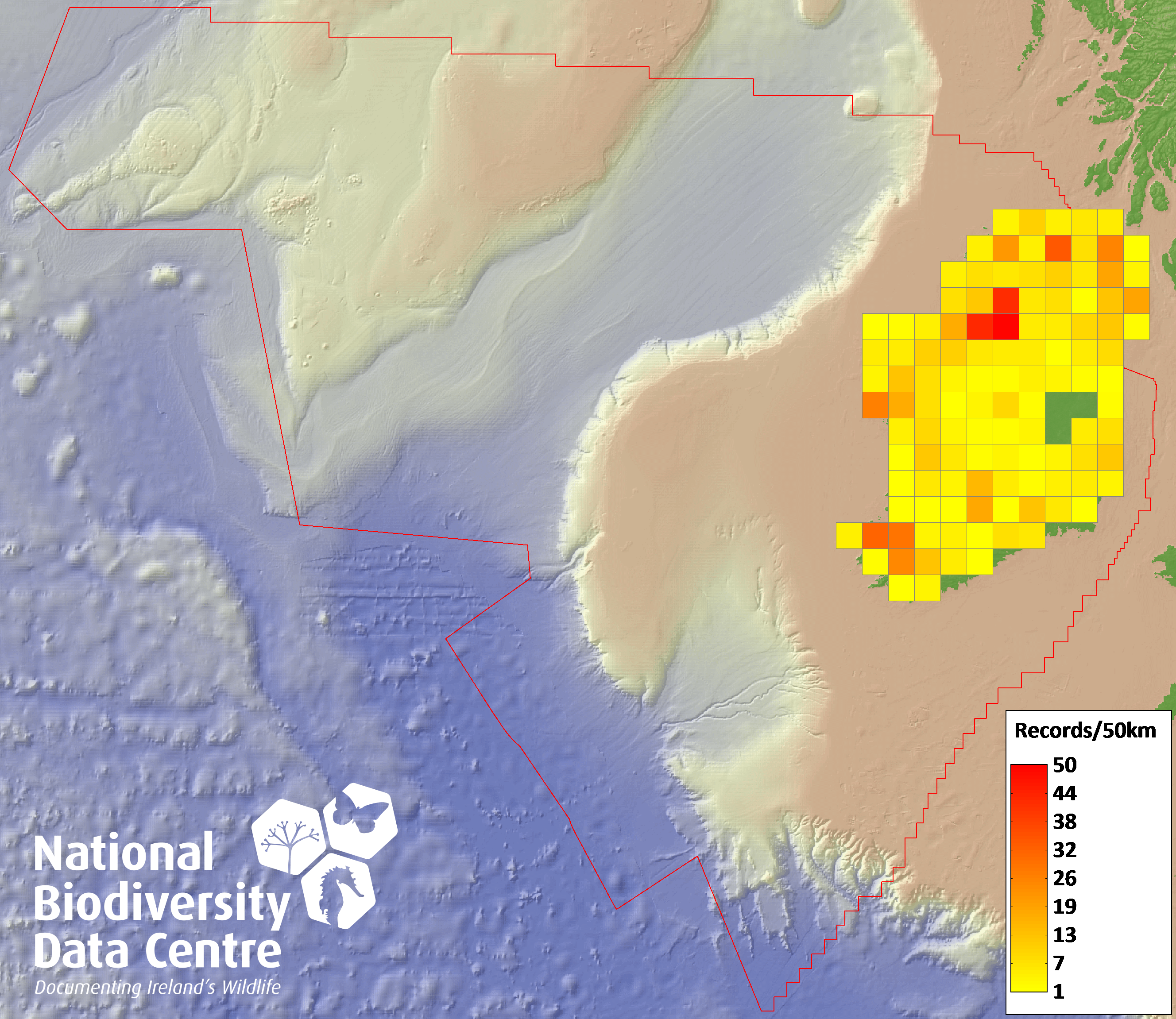 Distribution of the number of records recorded within each 10km grid square (ITM).Marine Map - 50km