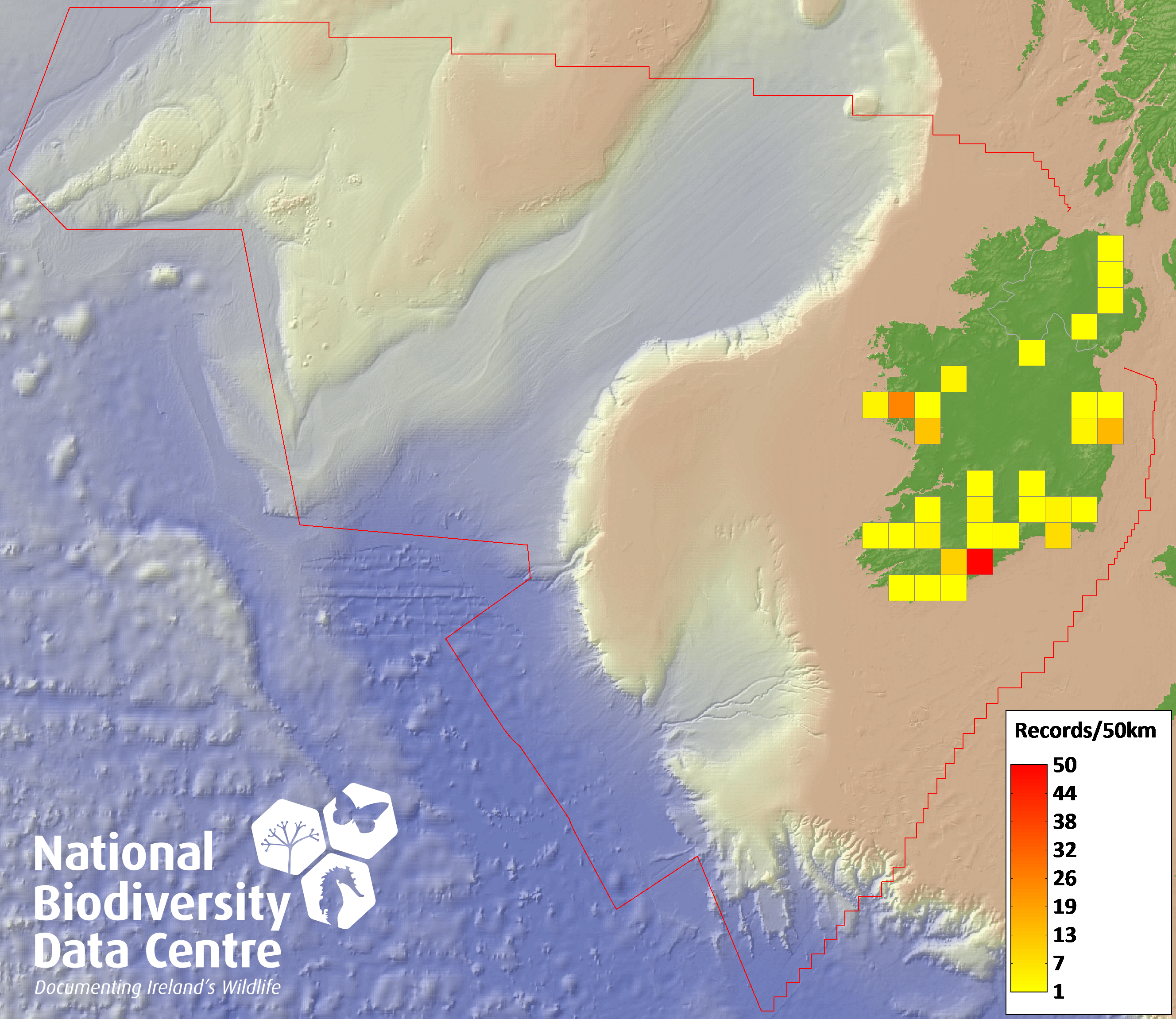Distribution of the number of records recorded within each 10km grid square (ITM).Marine Map - 50km