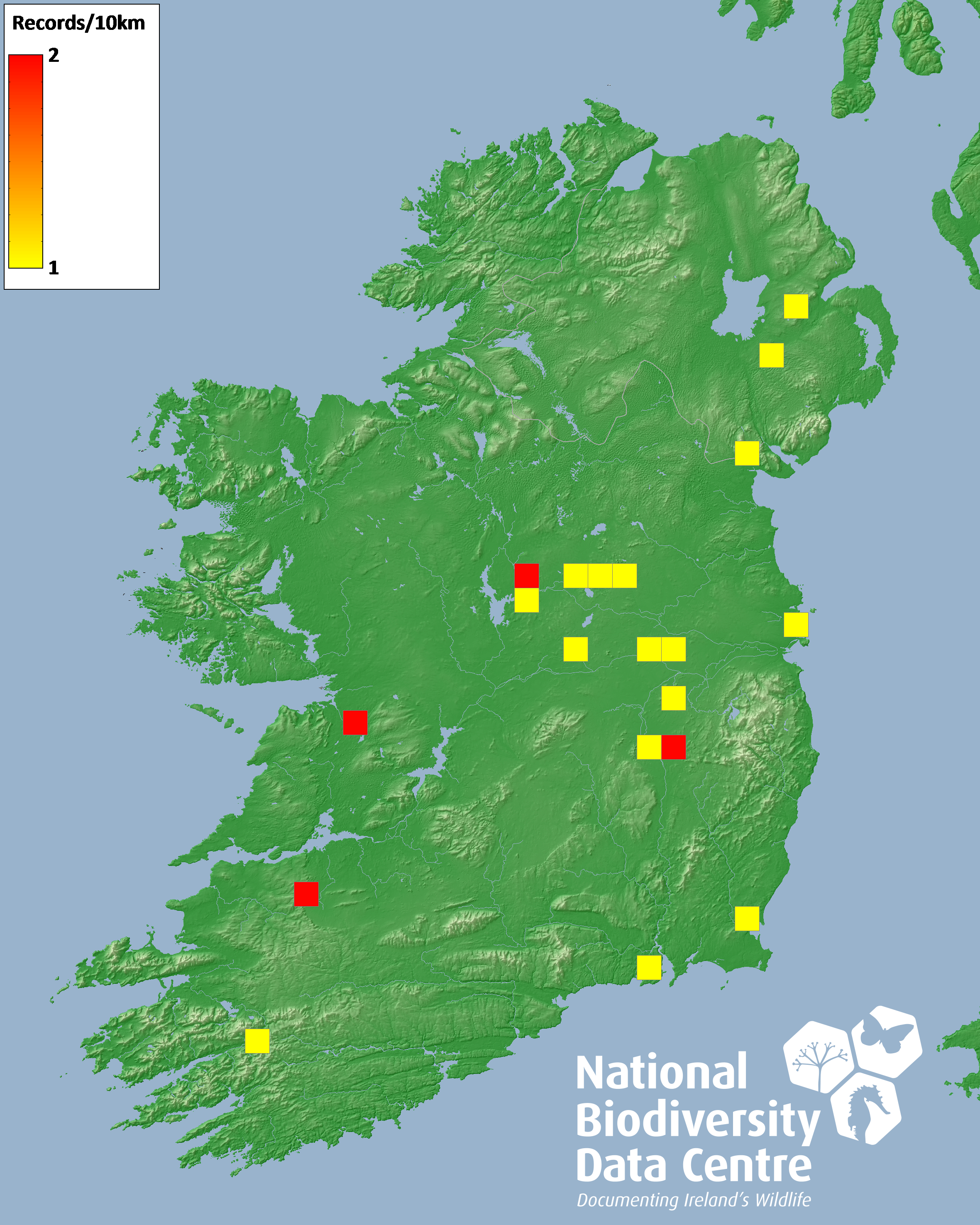 Distribution of the number of records recorded within each 10km grid square (ITM).Marine Map - 50km