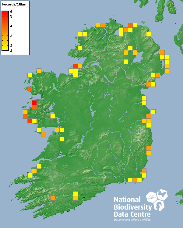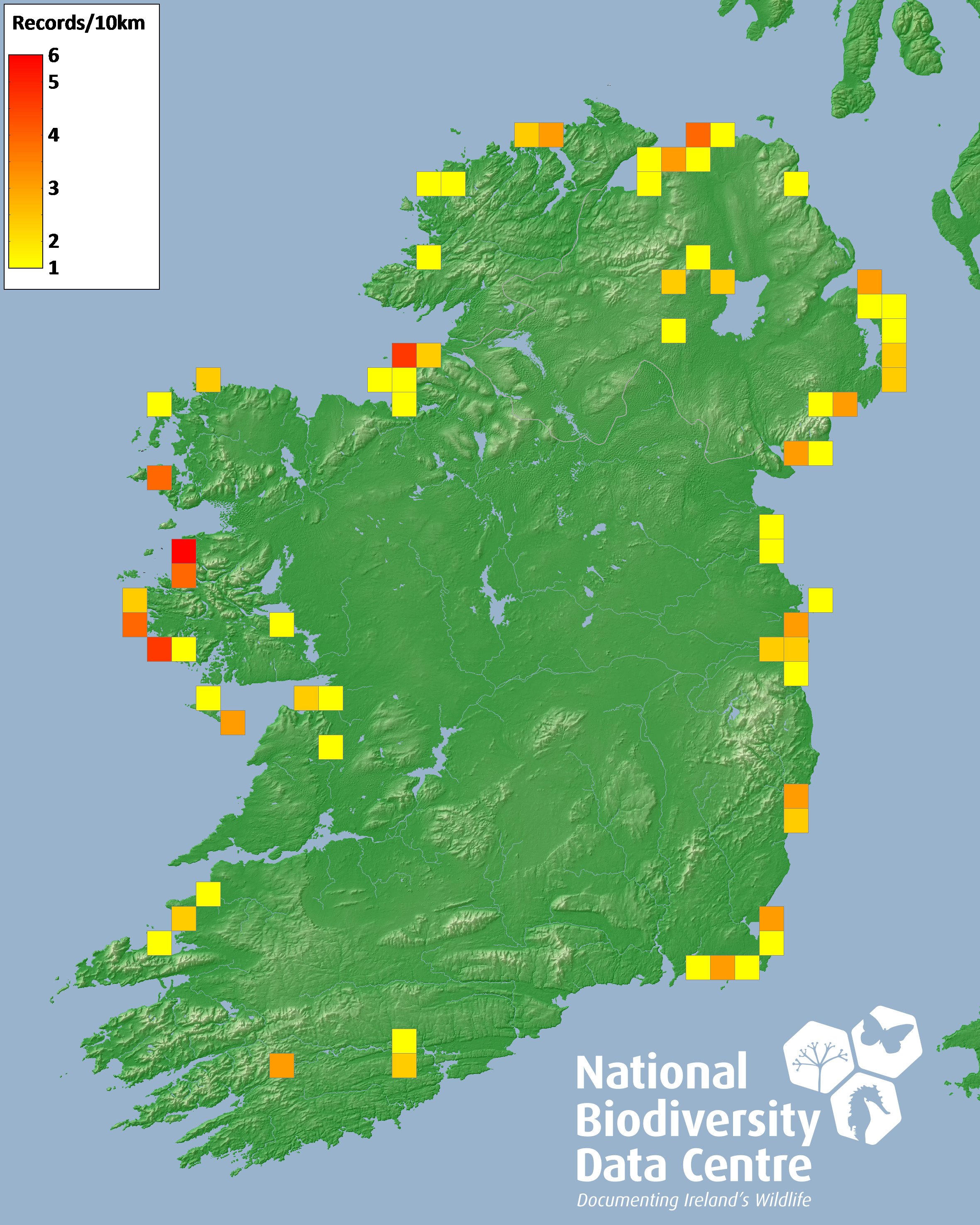 Distribution of the number of records recorded within each 10km grid square (ITM).Marine Map - 50km