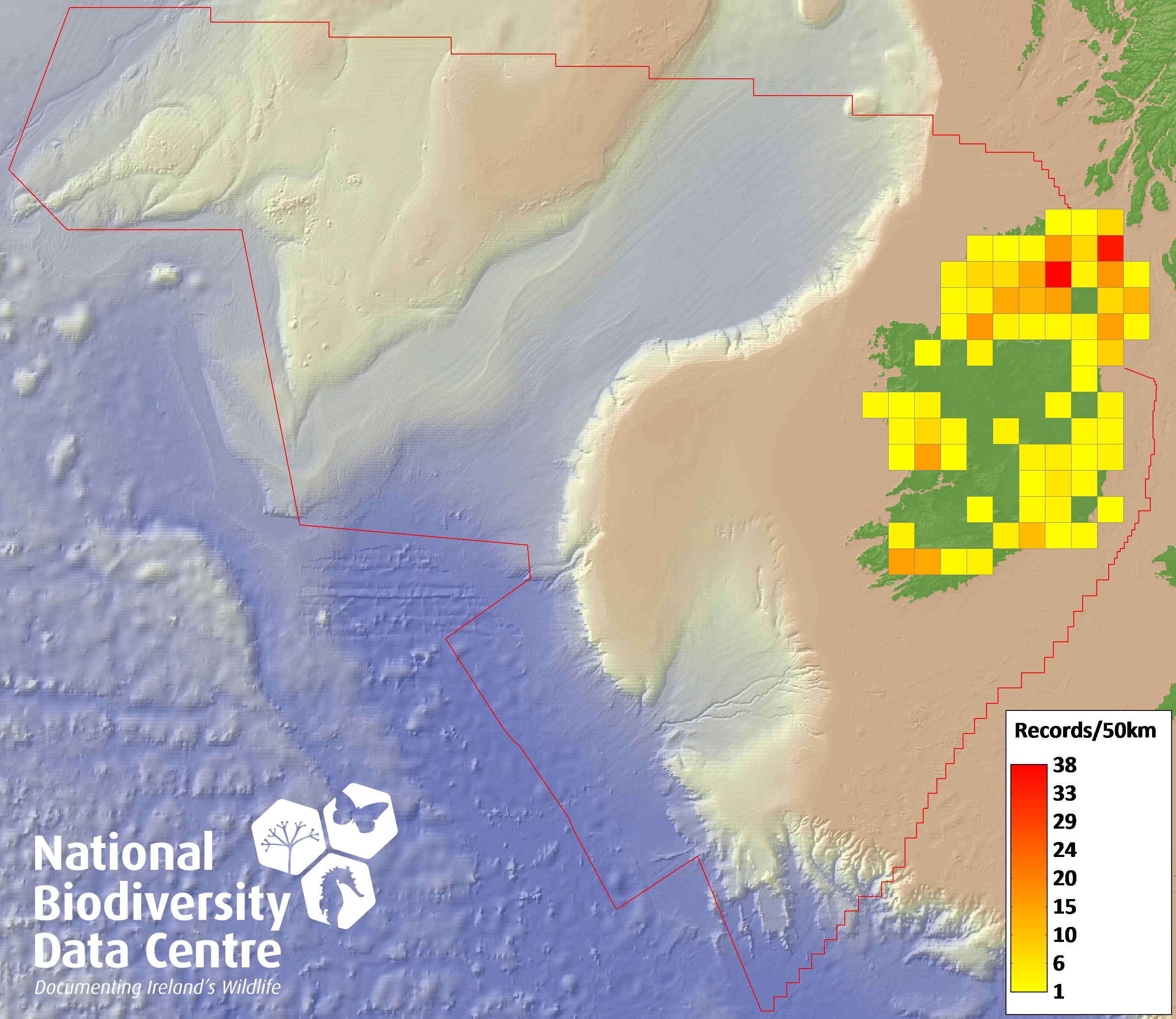 Distribution of the number of records recorded within each 10km grid square (ITM).Marine Map - 50km