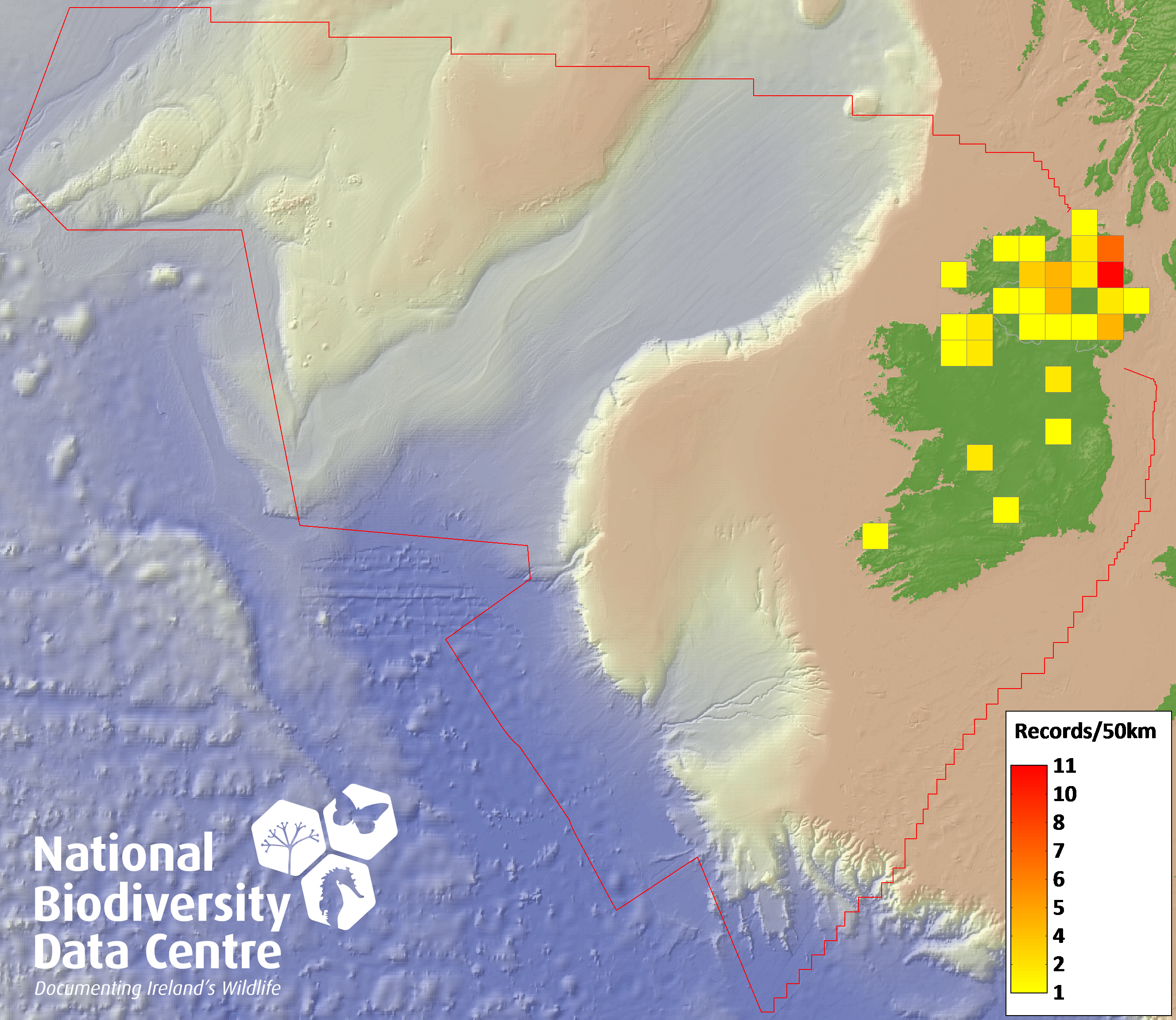 Distribution of the number of records recorded within each 10km grid square (ITM).Marine Map - 50km
