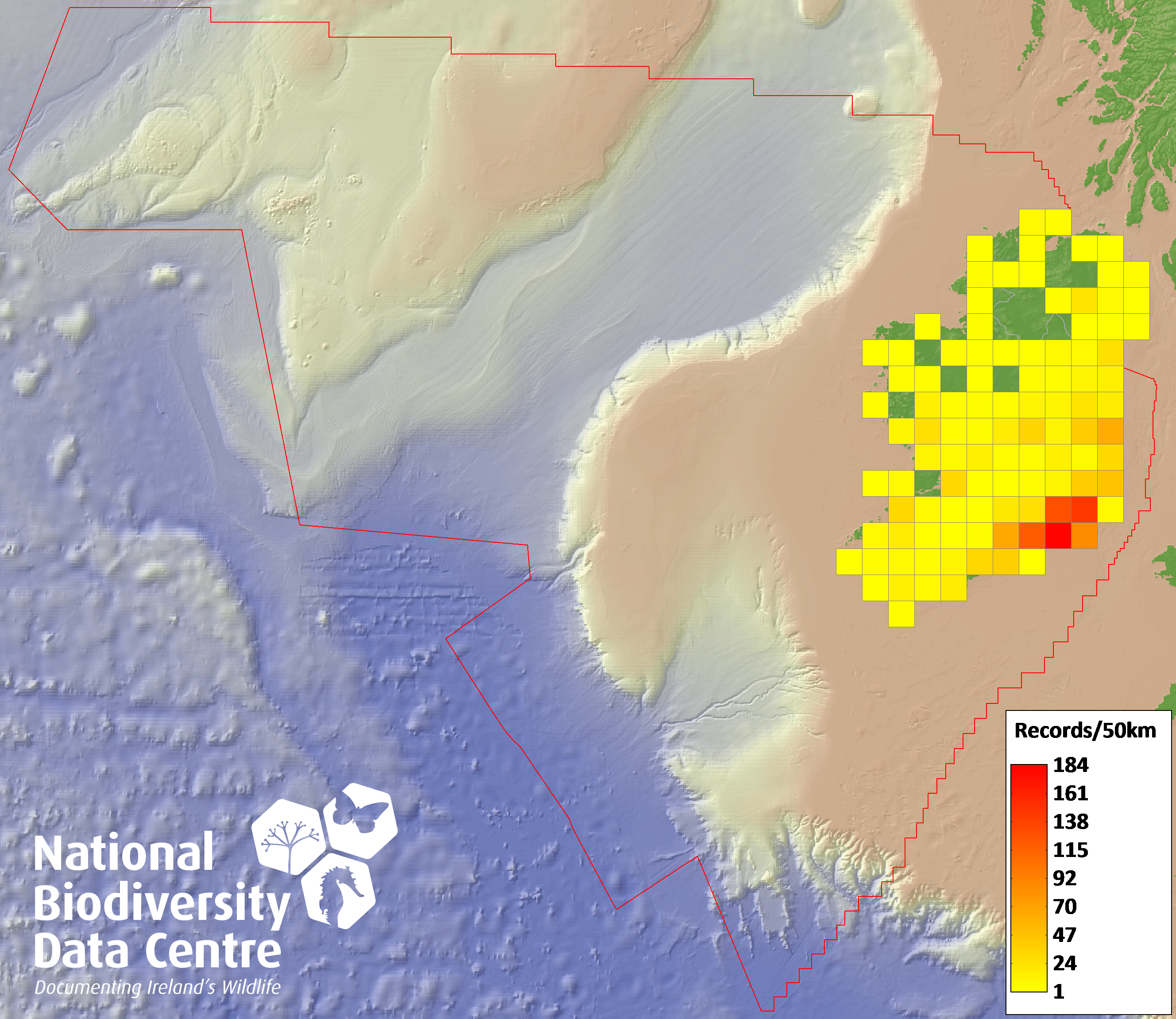 Distribution of the number of records recorded within each 10km grid square (ITM).Marine Map - 50km