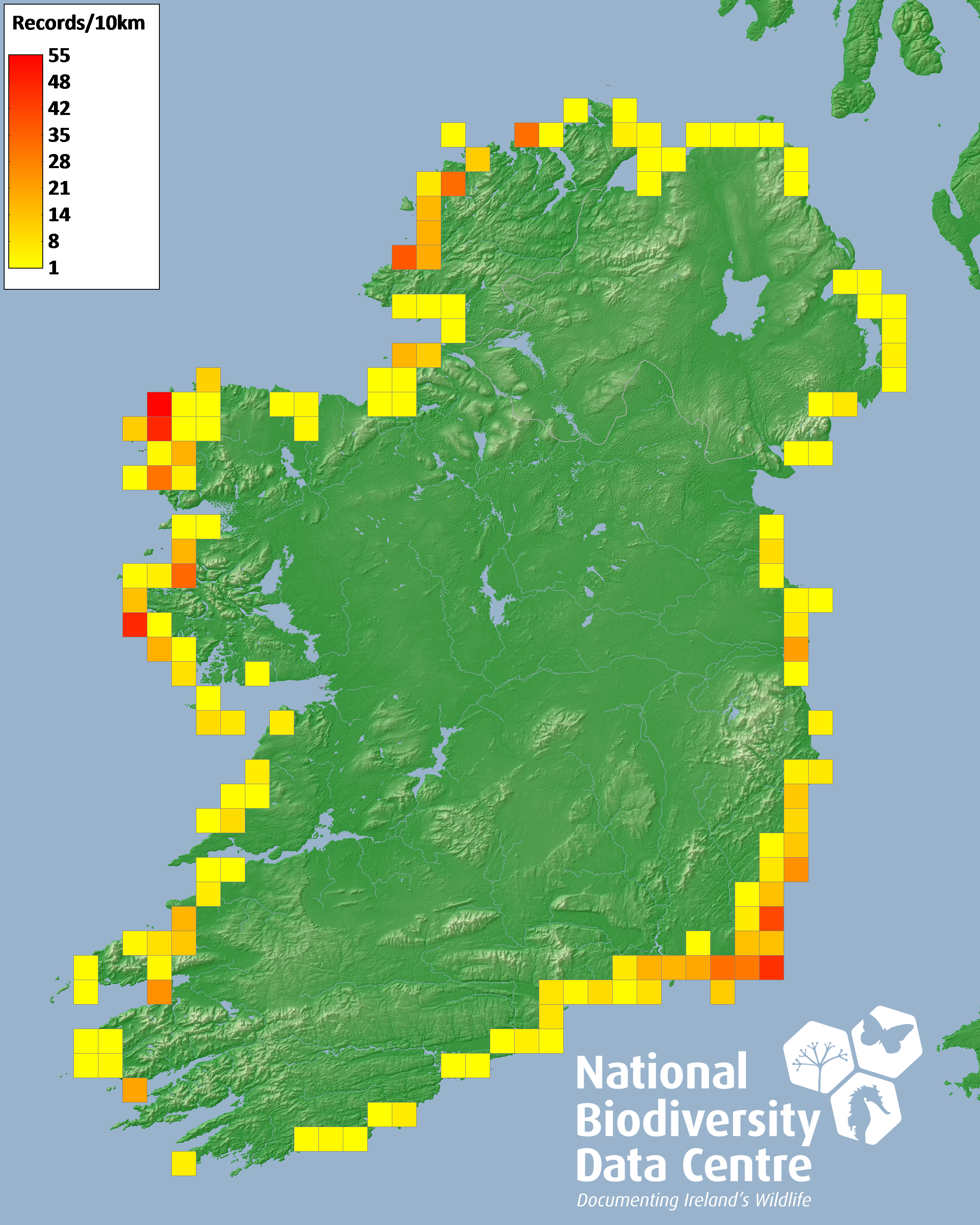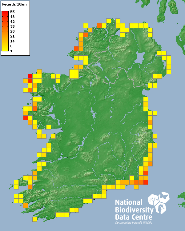 Distribution of the number of records recorded within each 10km grid square (ITM).Marine Map - 50km