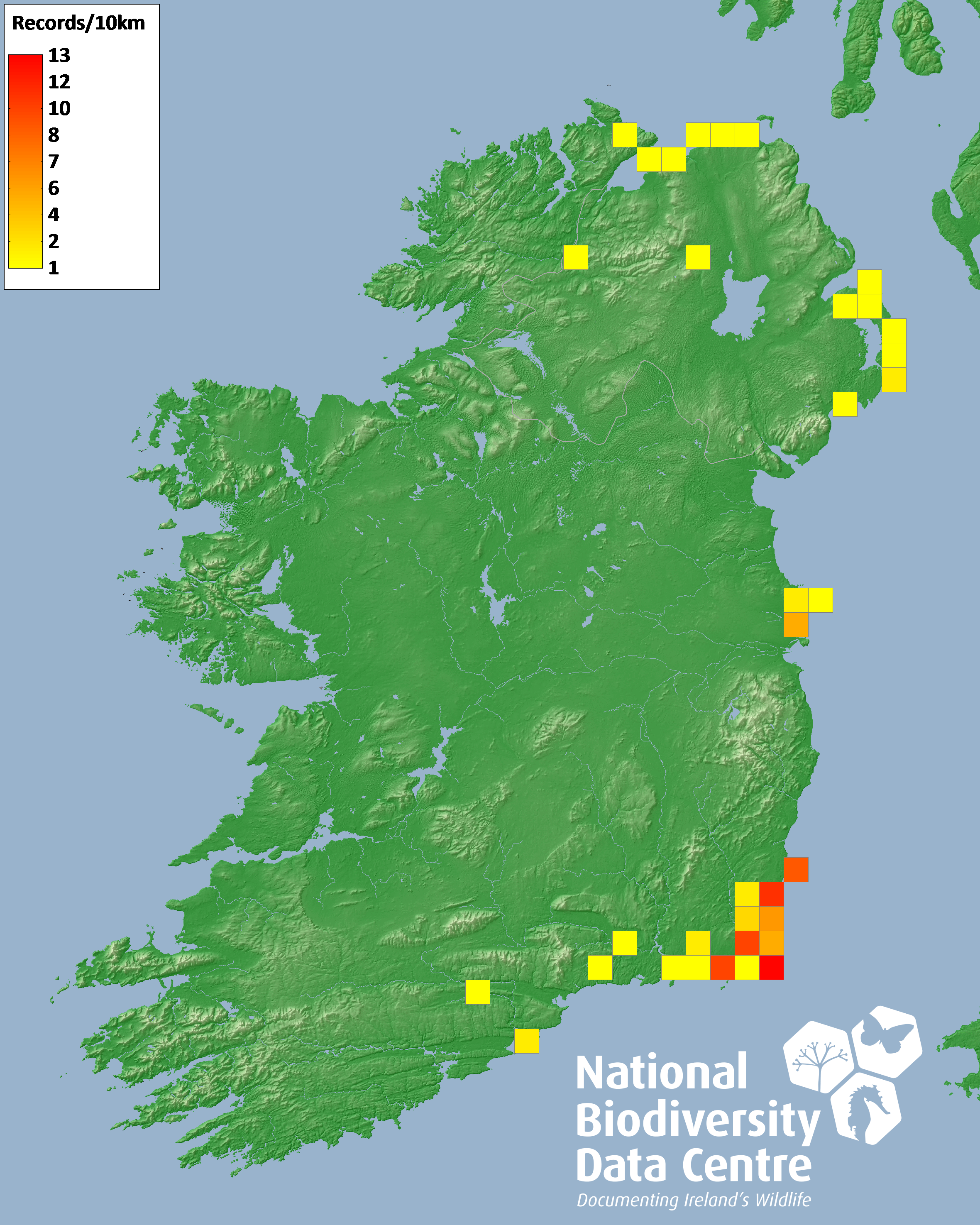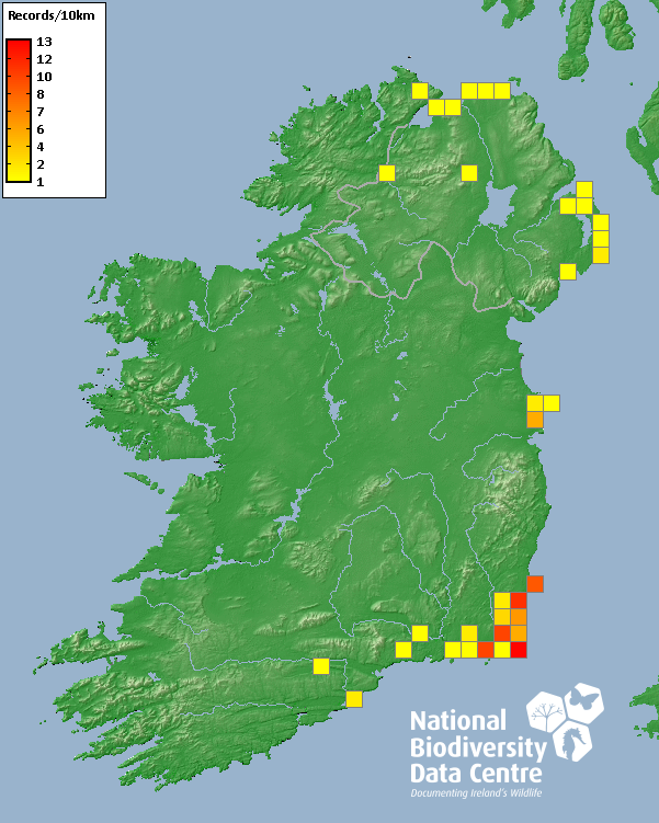 Distribution of the number of records recorded within each 10km grid square (ITM).Marine Map - 50km
