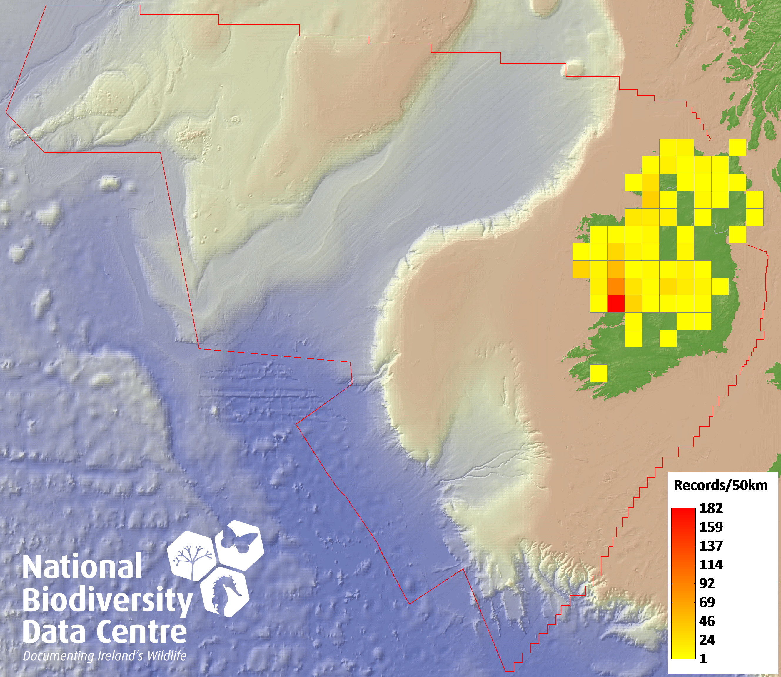 Distribution of the number of records recorded within each 10km grid square (ITM).Marine Map - 50km