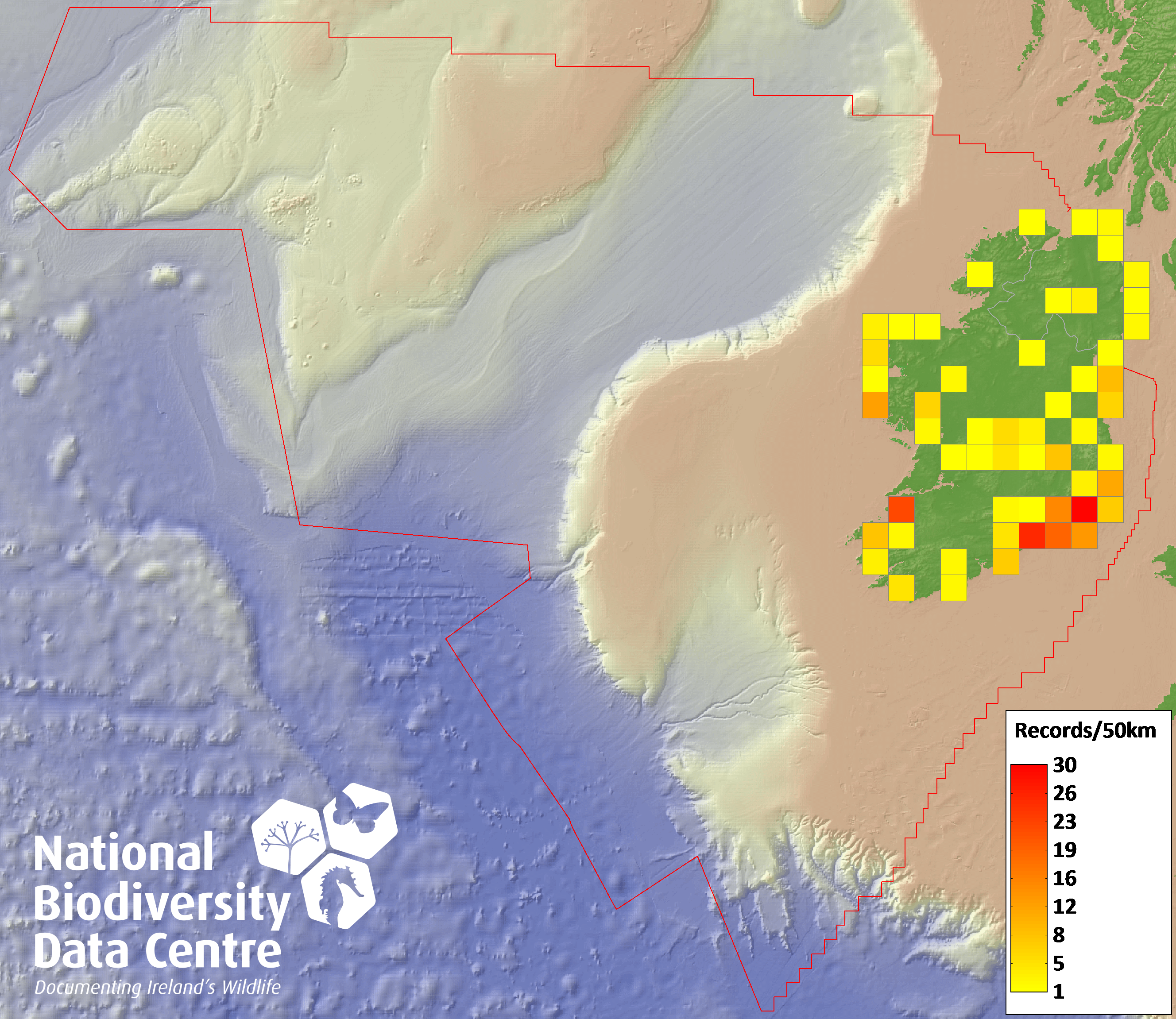 Distribution of the number of records recorded within each 10km grid square (ITM).Marine Map - 50km