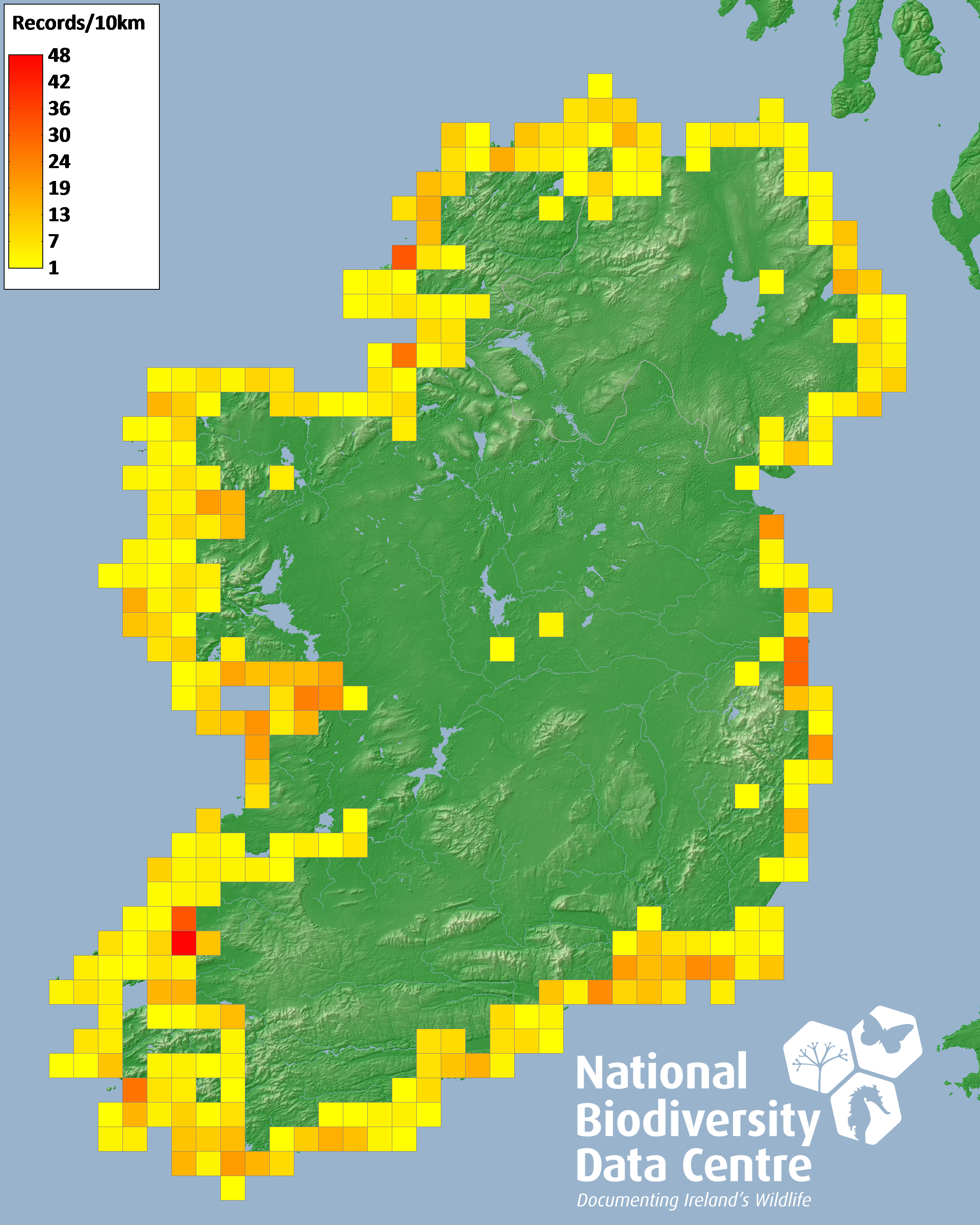 Distribution of the number of records recorded within each 10km grid square (ITM).Marine Map - 50km