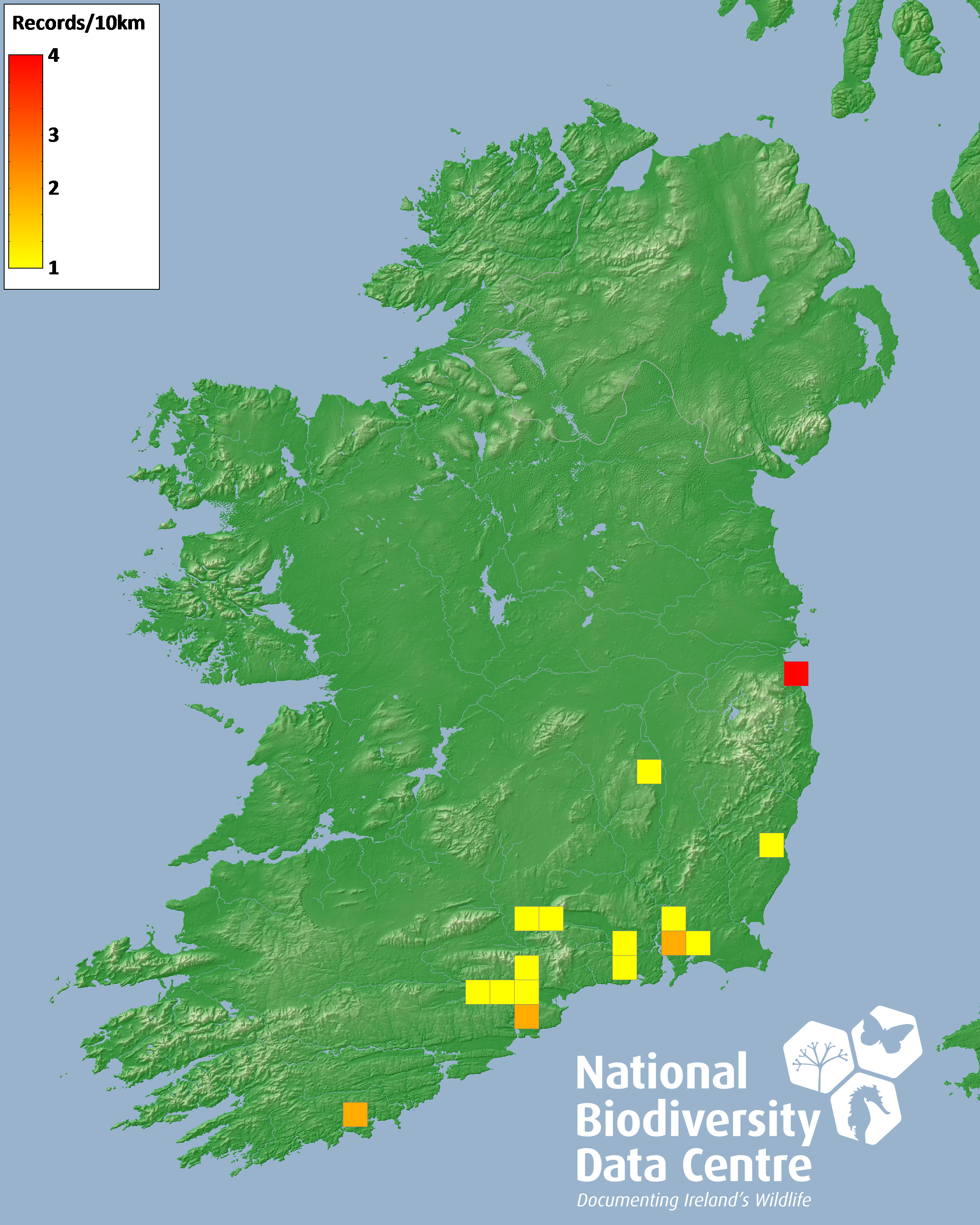 Distribution of the number of records recorded within each 10km grid square (ITM).Marine Map - 50km
