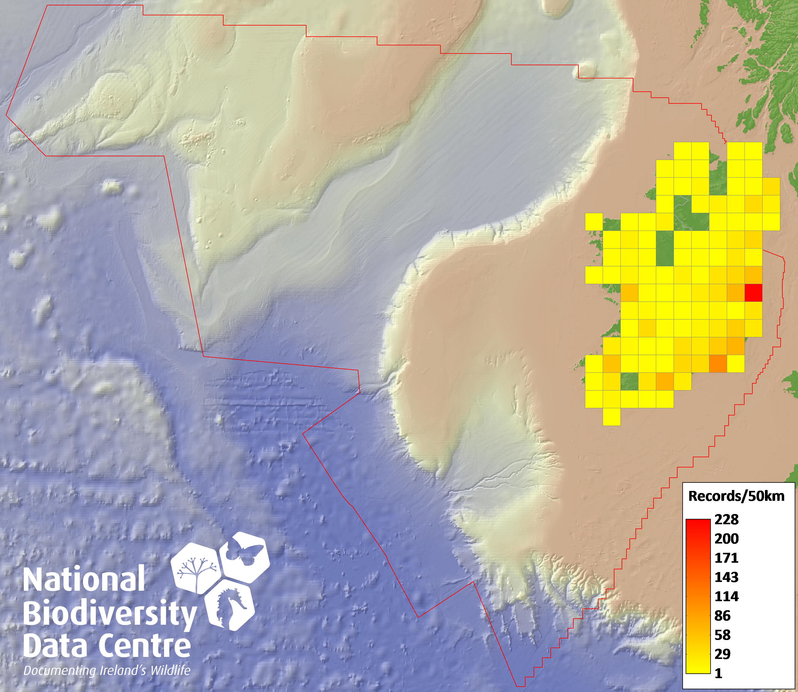 Distribution of the number of records recorded within each 10km grid square (ITM).Marine Map - 50km