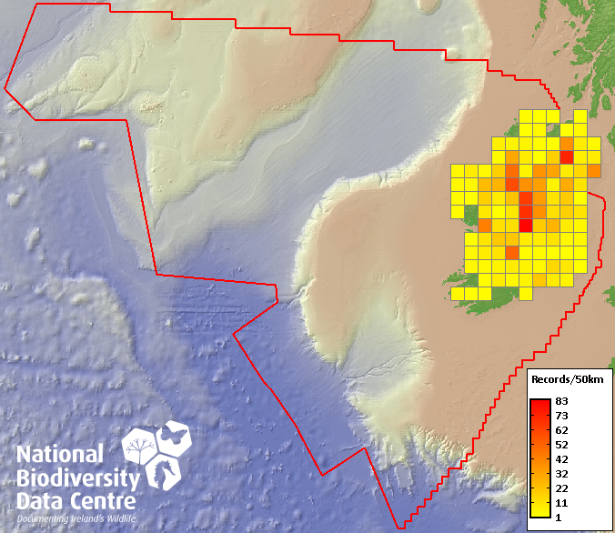 Distribution of the number of records recorded within each 10km grid square (ITM).Marine Map - 50km