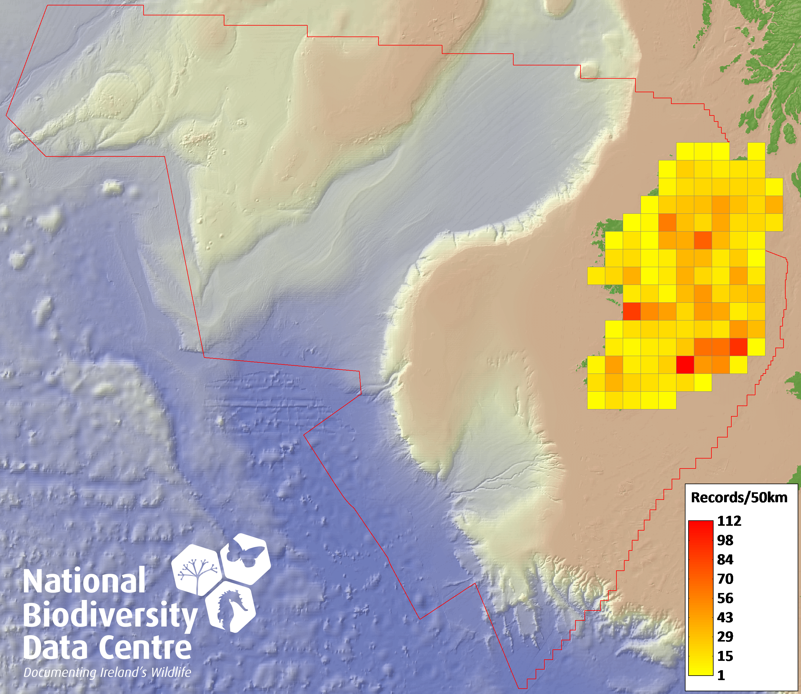 Distribution of the number of records recorded within each 10km grid square (ITM).Marine Map - 50km