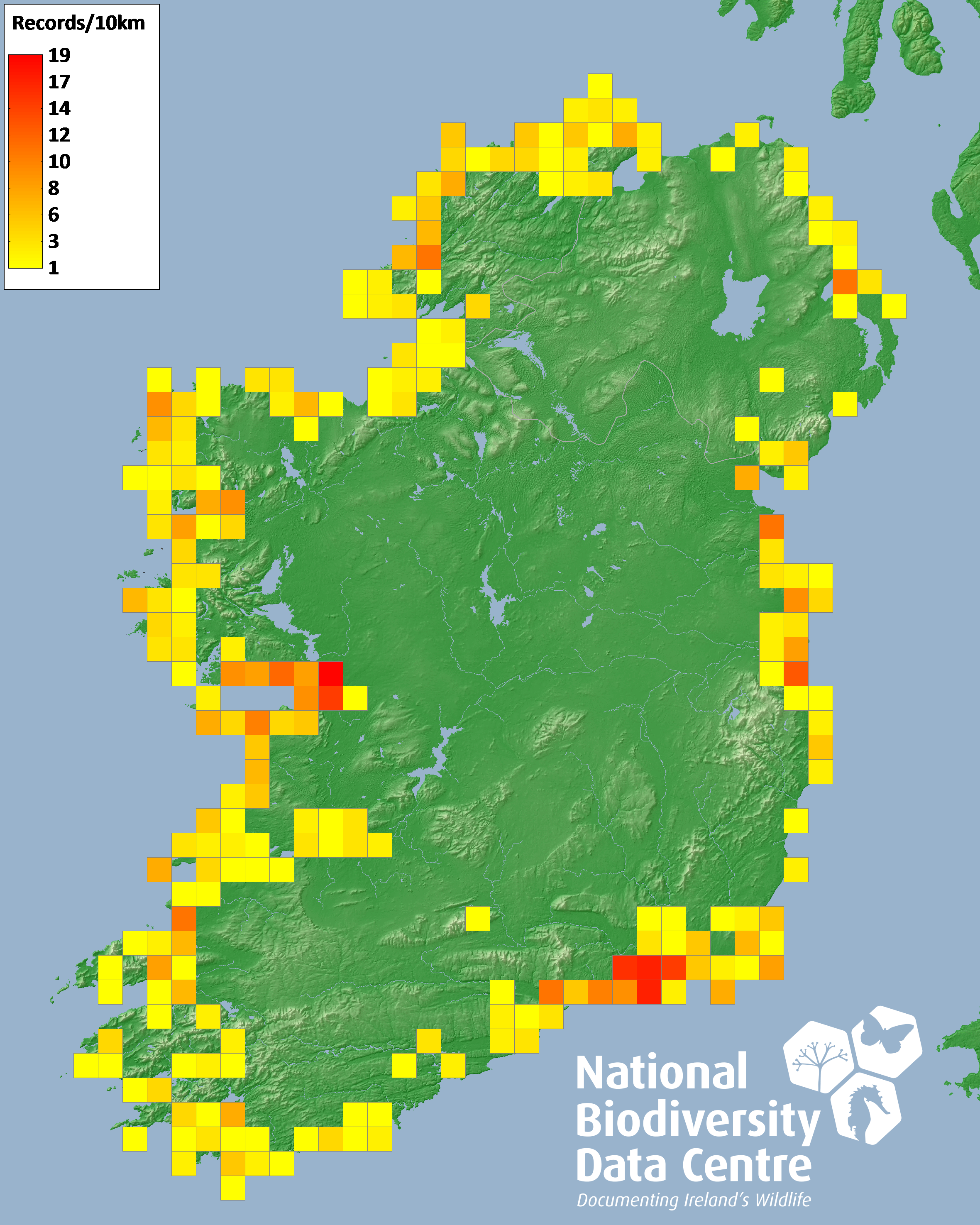 Distribution of the number of records recorded within each 10km grid square (ITM).Marine Map - 50km