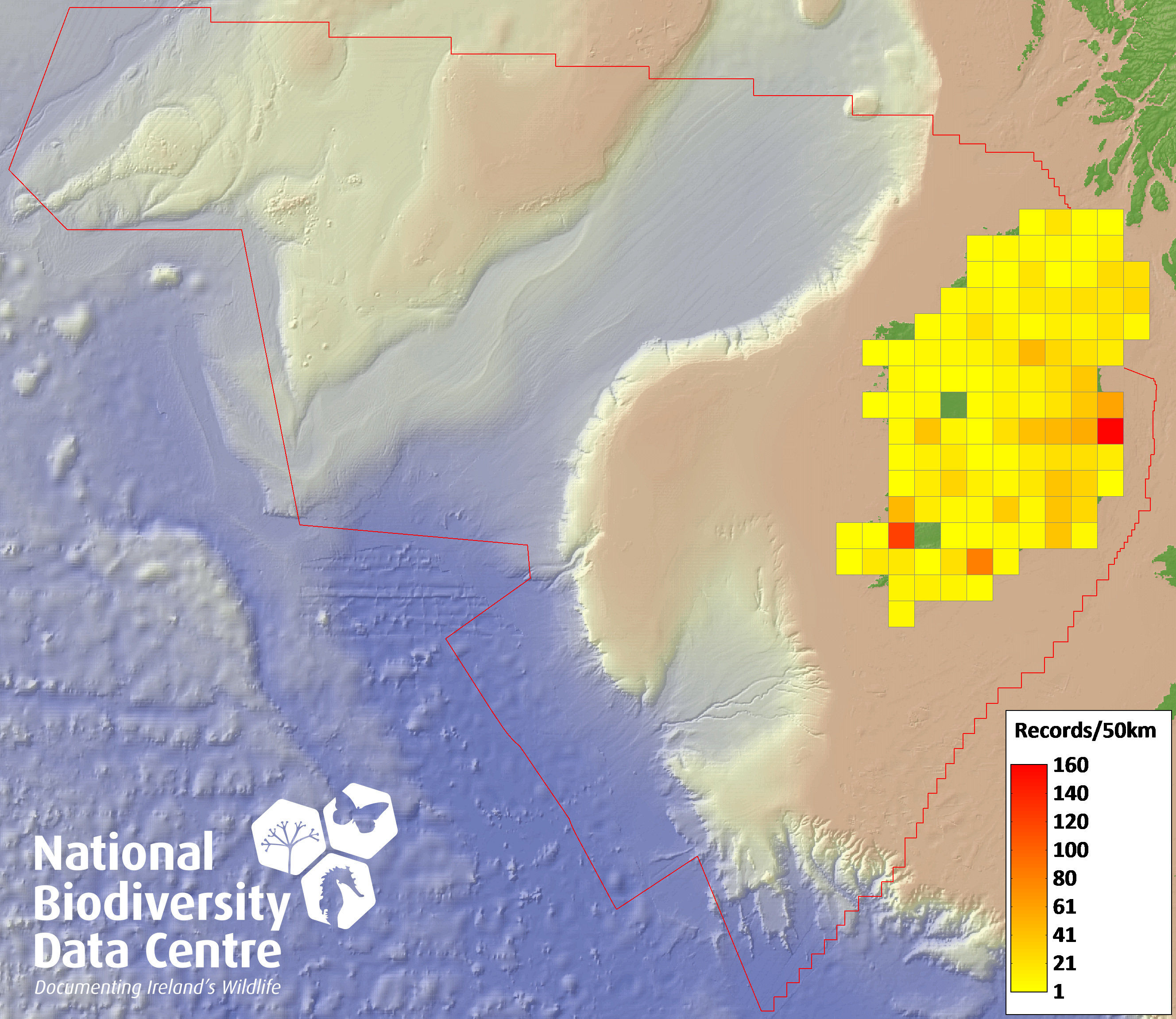 Distribution of the number of records recorded within each 10km grid square (ITM).Marine Map - 50km