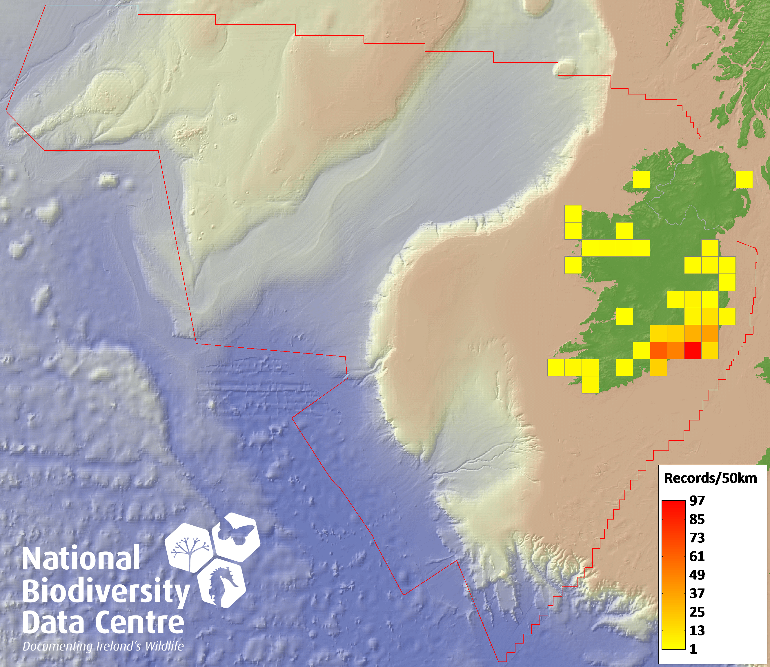 Distribution of the number of records recorded within each 10km grid square (ITM).Marine Map - 50km