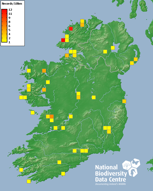 Distribution of the number of records recorded within each 10km grid square (ITM).Marine Map - 50km