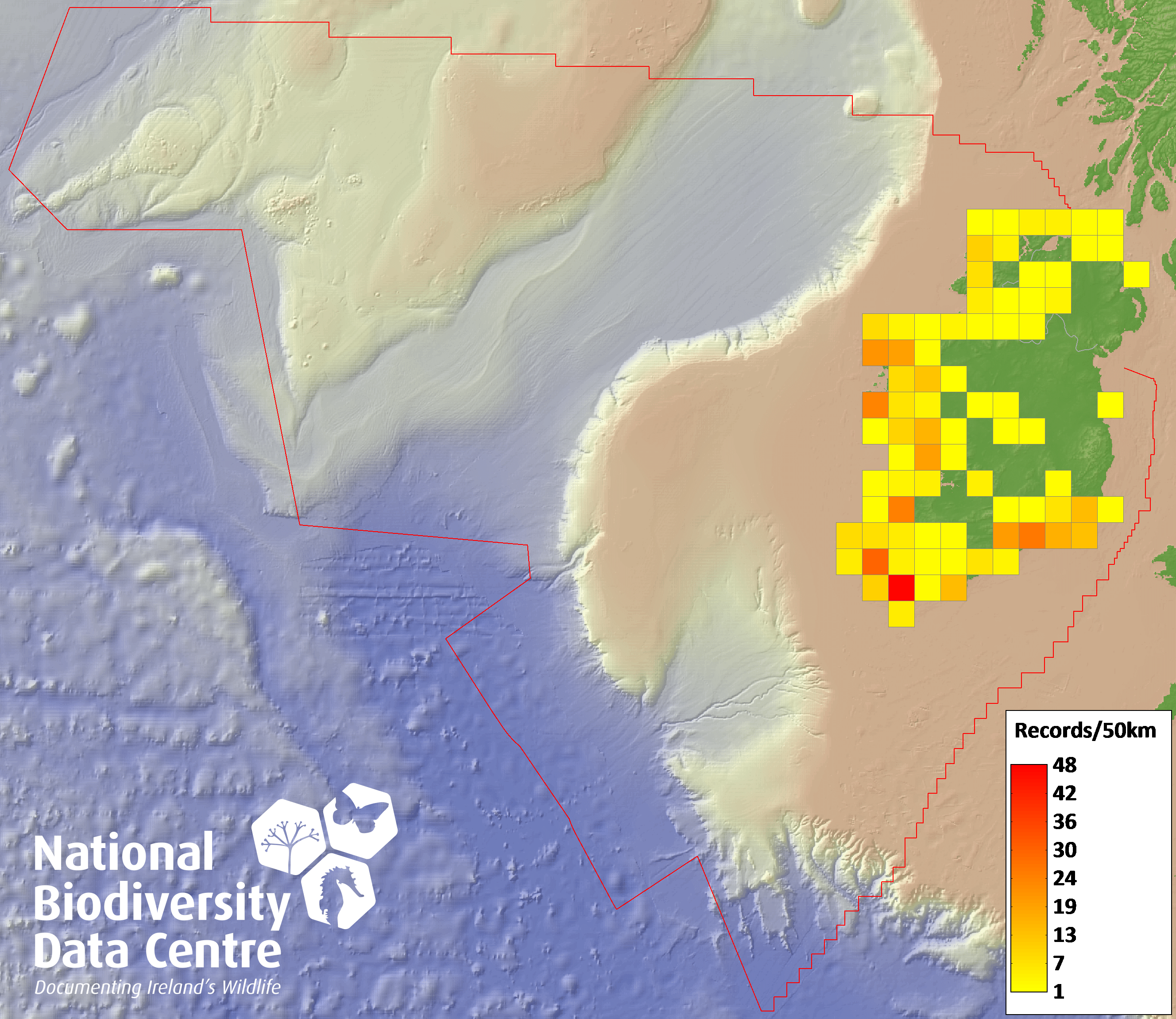 Distribution of the number of records recorded within each 10km grid square (ITM).Marine Map - 50km