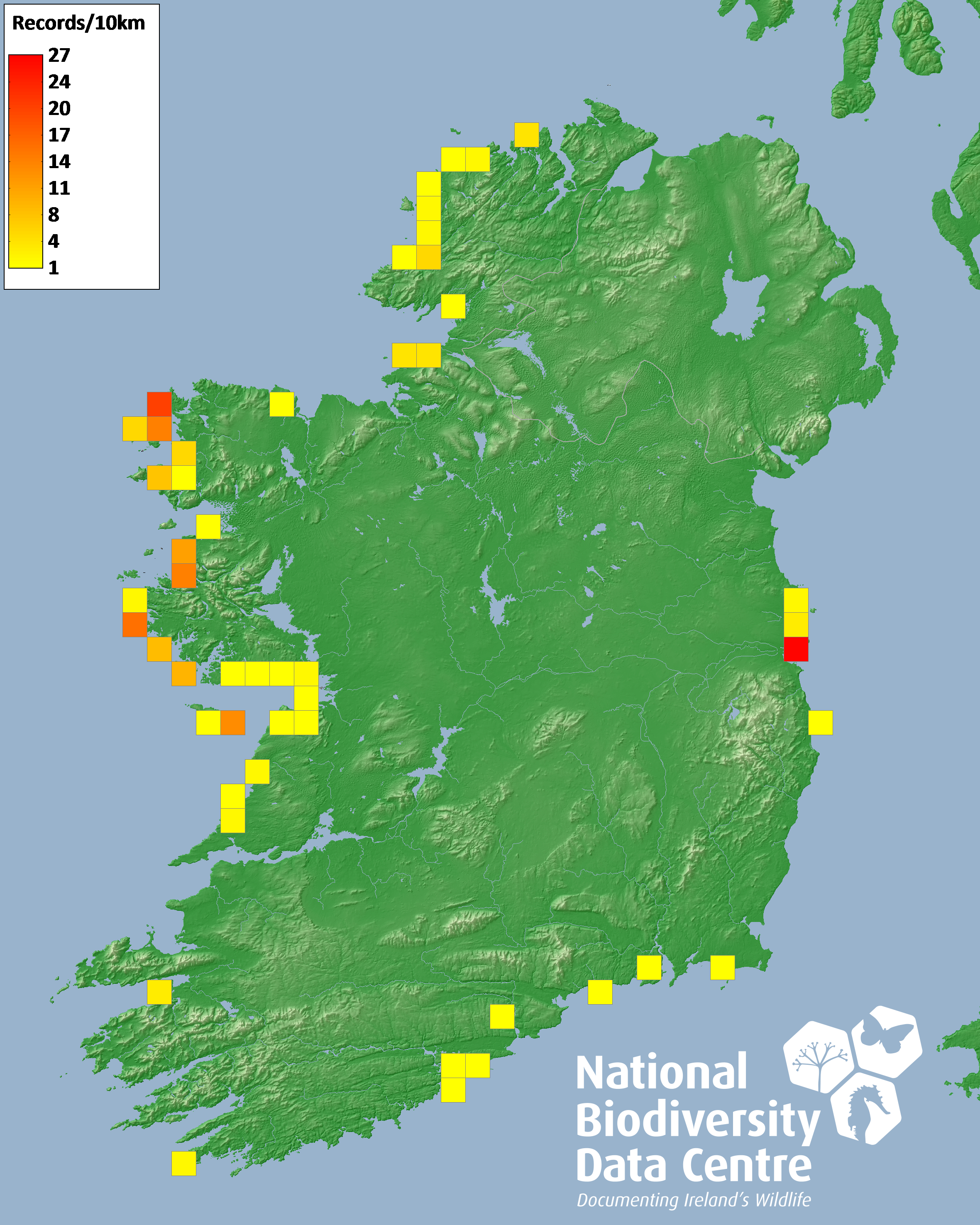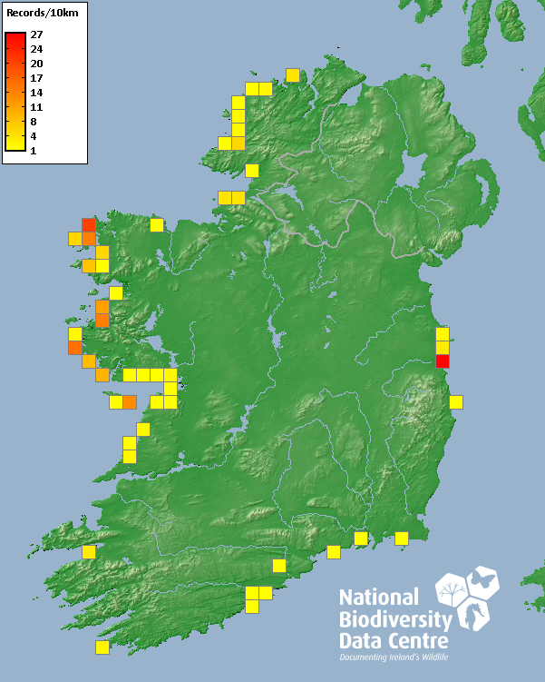 Distribution of the number of records recorded within each 10km grid square (ITM).Marine Map - 50km