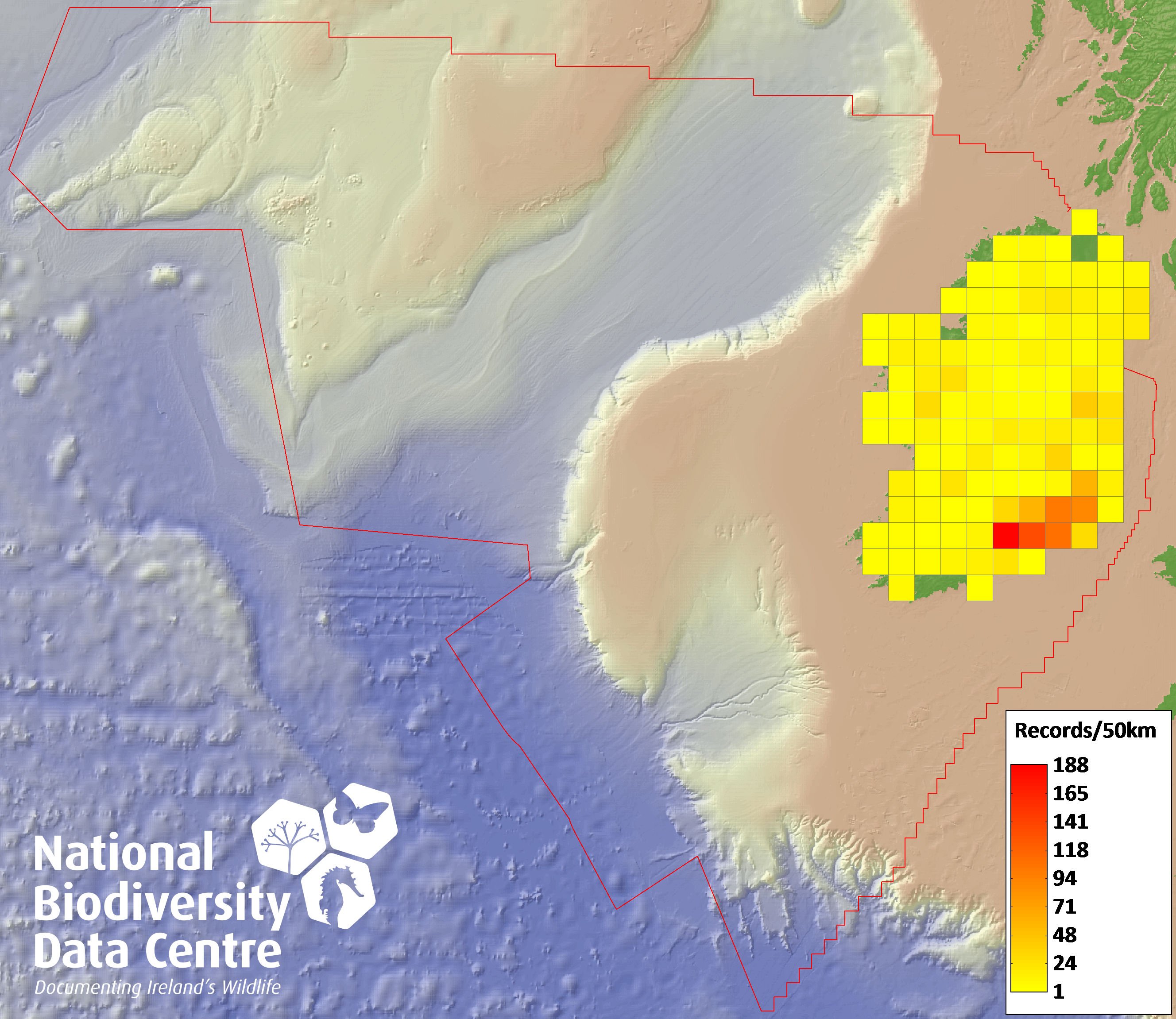 Distribution of the number of records recorded within each 10km grid square (ITM).Marine Map - 50km