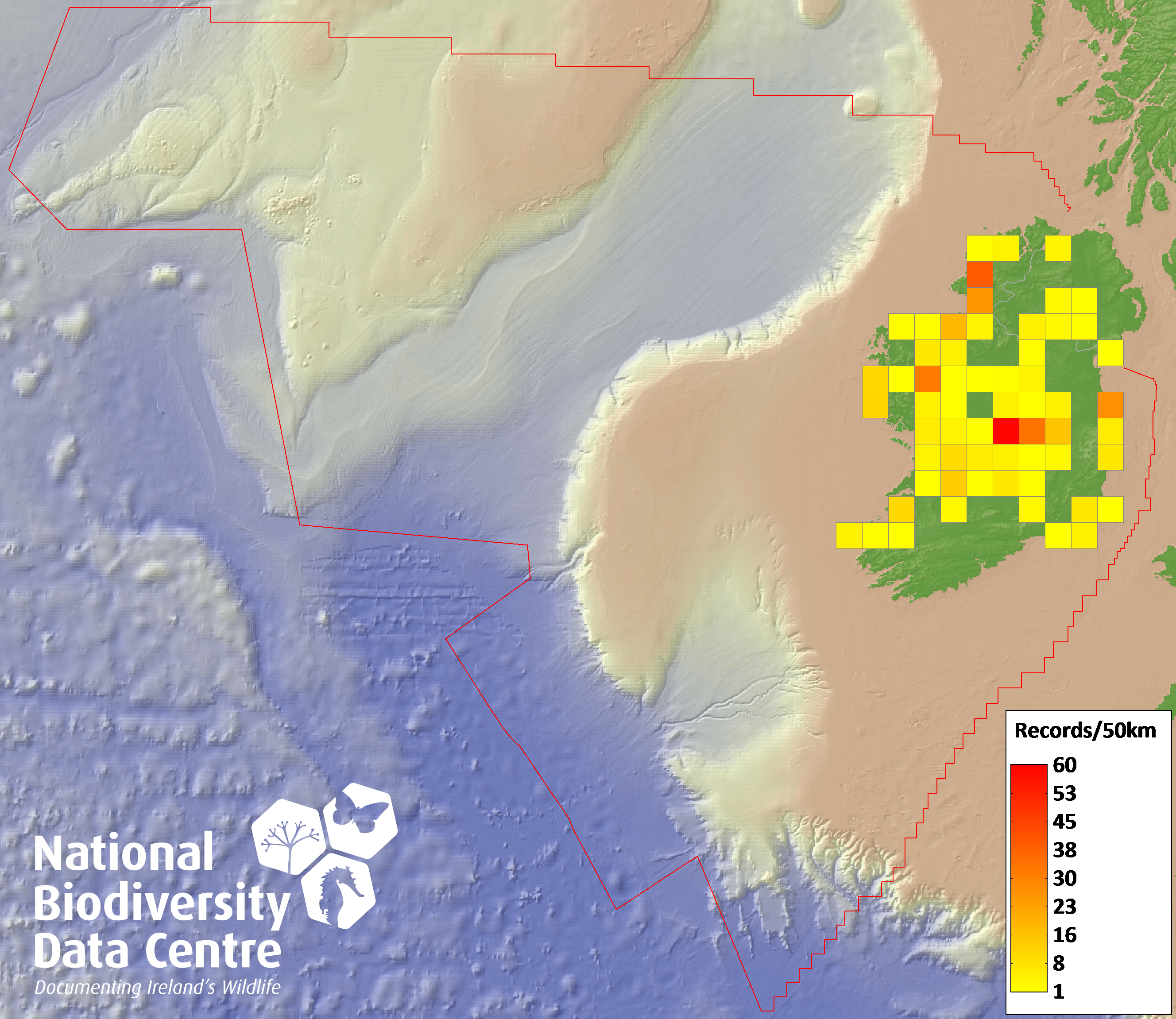Distribution of the number of records recorded within each 10km grid square (ITM).Marine Map - 50km