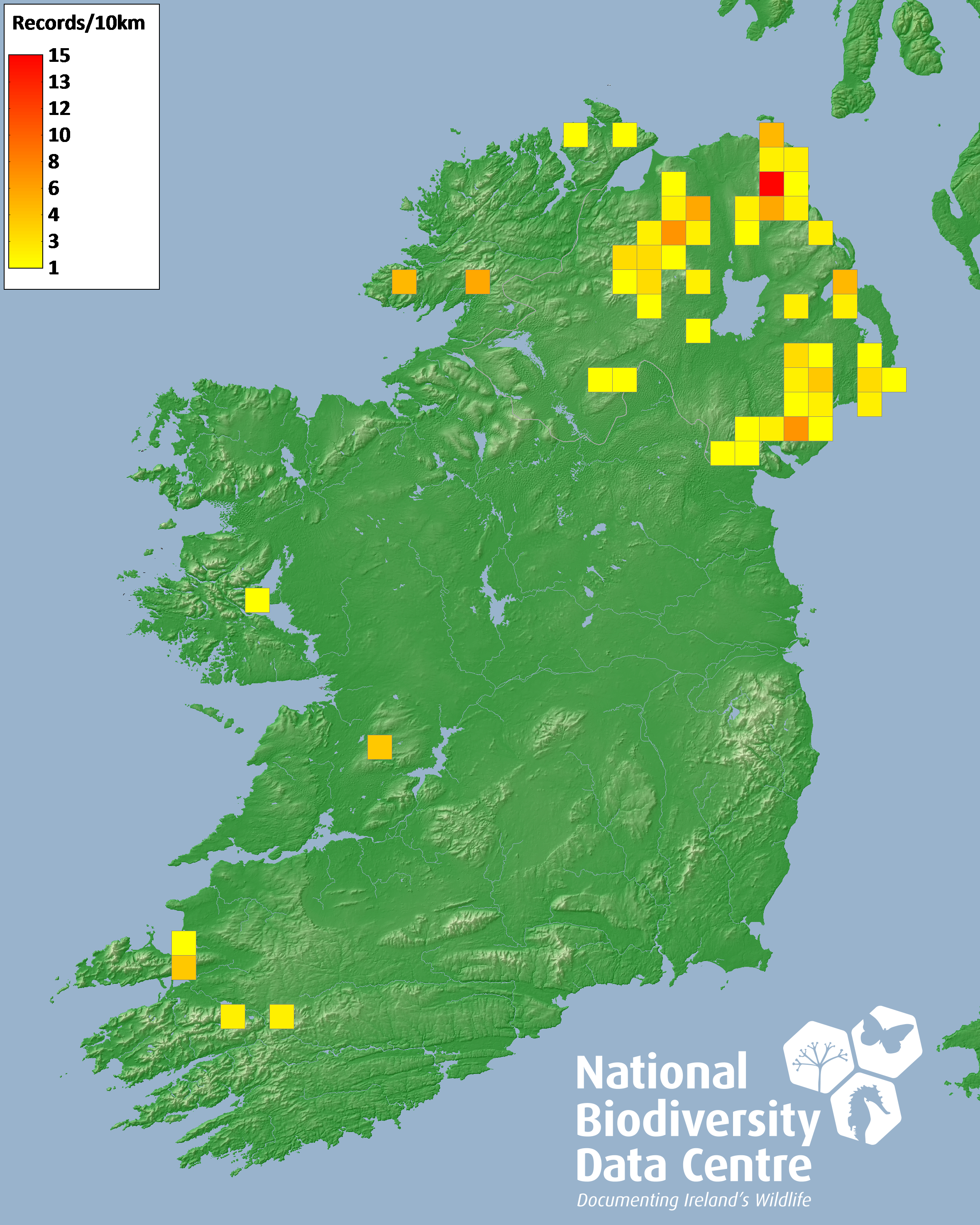 Distribution of the number of records recorded within each 10km grid square (ITM).Marine Map - 50km