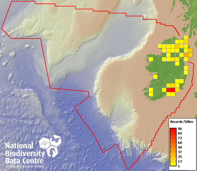 Distribution of the number of records recorded within each 10km grid square (ITM).Marine Map - 50km