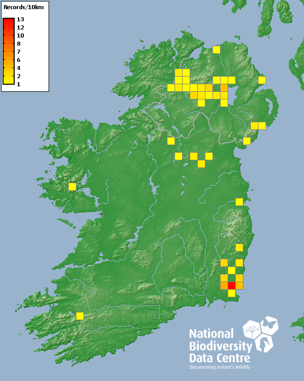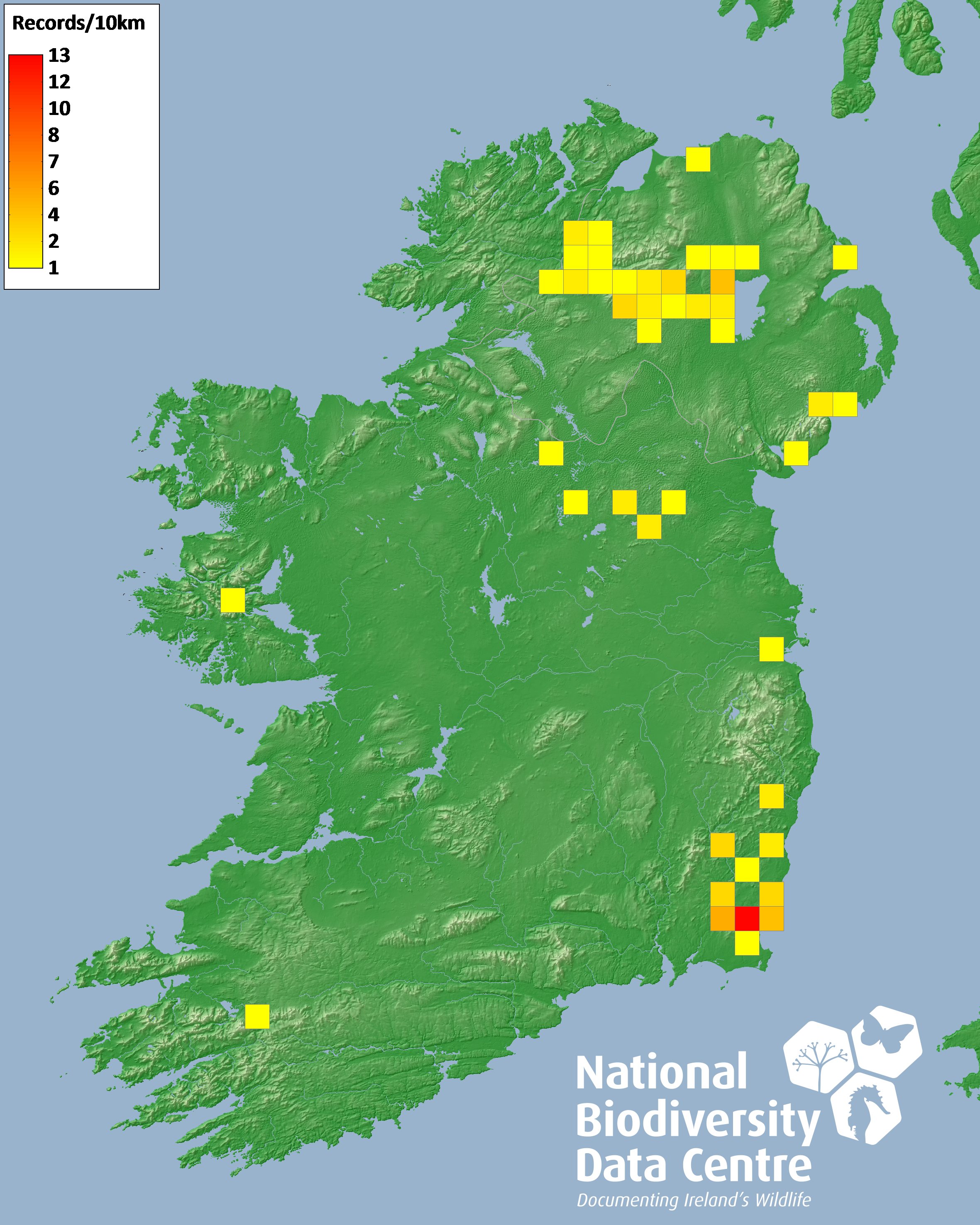 Distribution of the number of records recorded within each 10km grid square (ITM).Marine Map - 50km