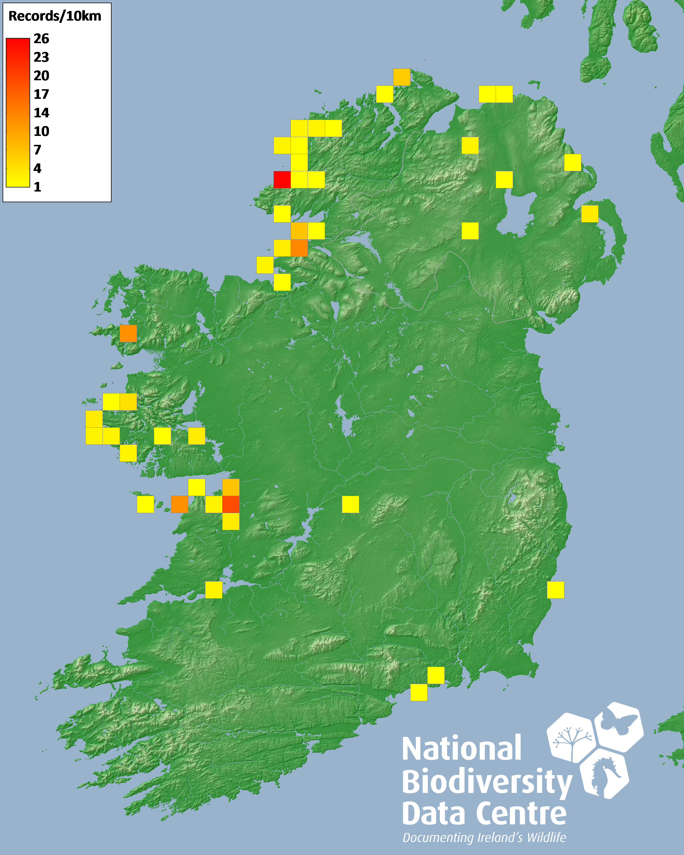 Distribution of the number of records recorded within each 10km grid square (ITM).Marine Map - 50km