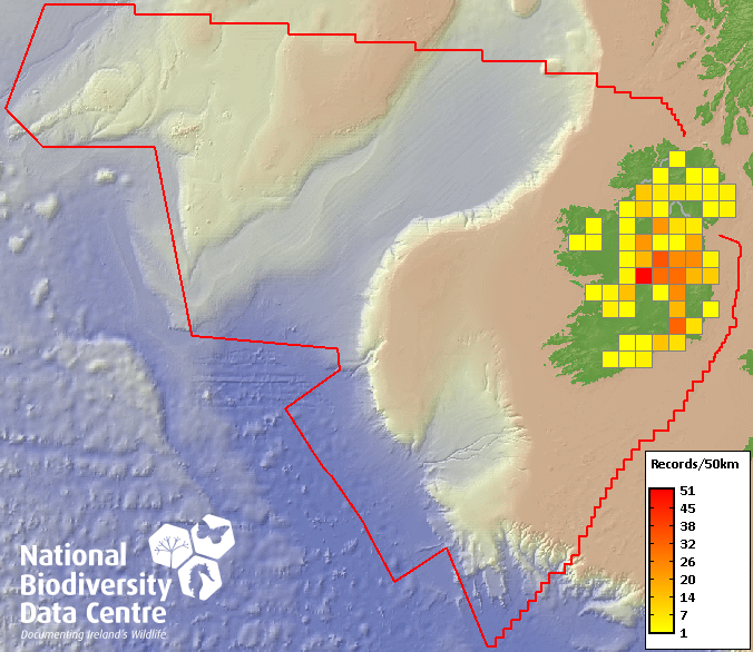 Distribution of the number of records recorded within each 10km grid square (ITM).Marine Map - 50km