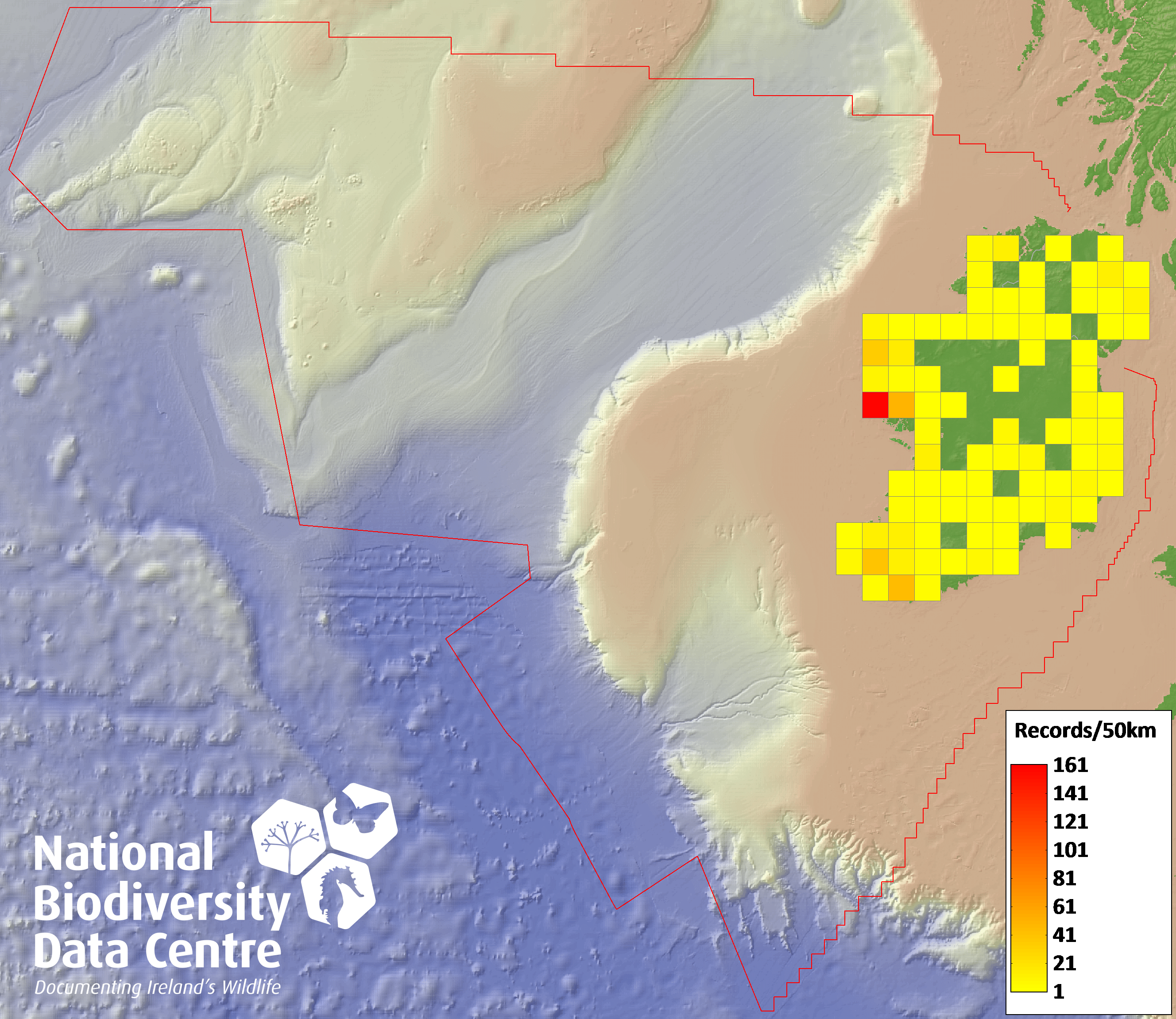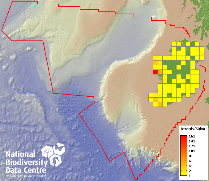 Distribution of the number of records recorded within each 10km grid square (ITM).Marine Map - 50km