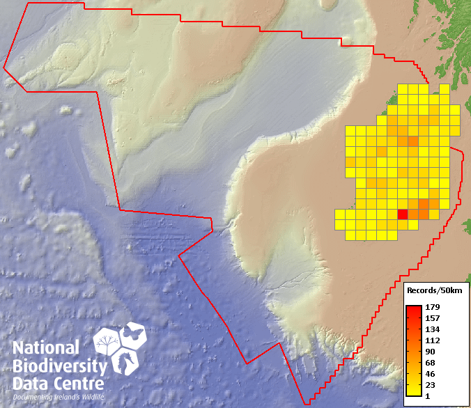 Distribution of the number of records recorded within each 10km grid square (ITM).Marine Map - 50km
