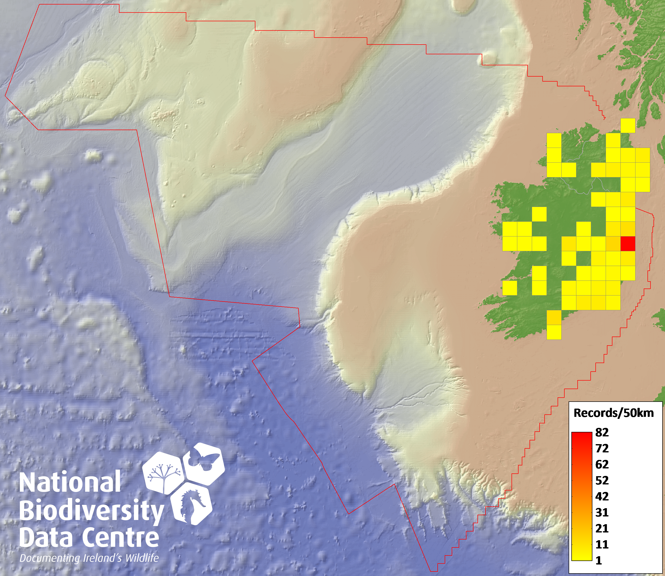 Distribution of the number of records recorded within each 10km grid square (ITM).Marine Map - 50km