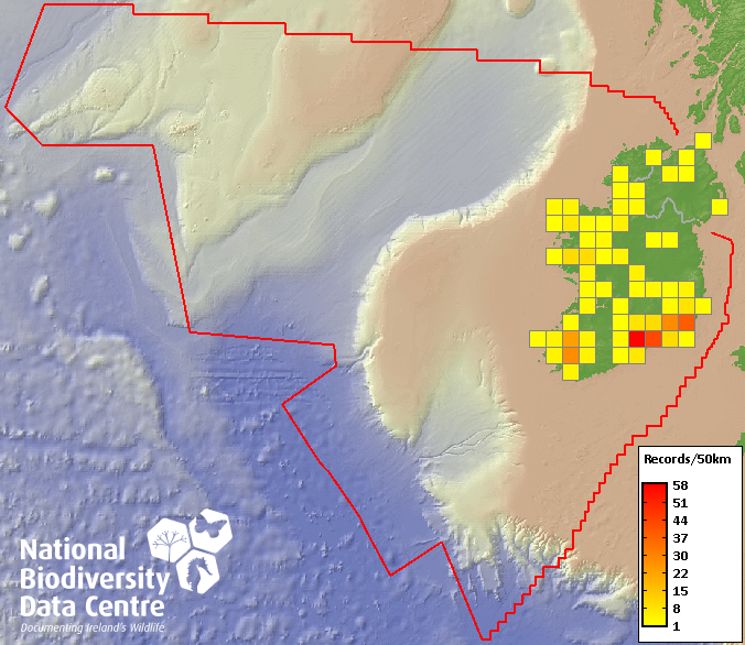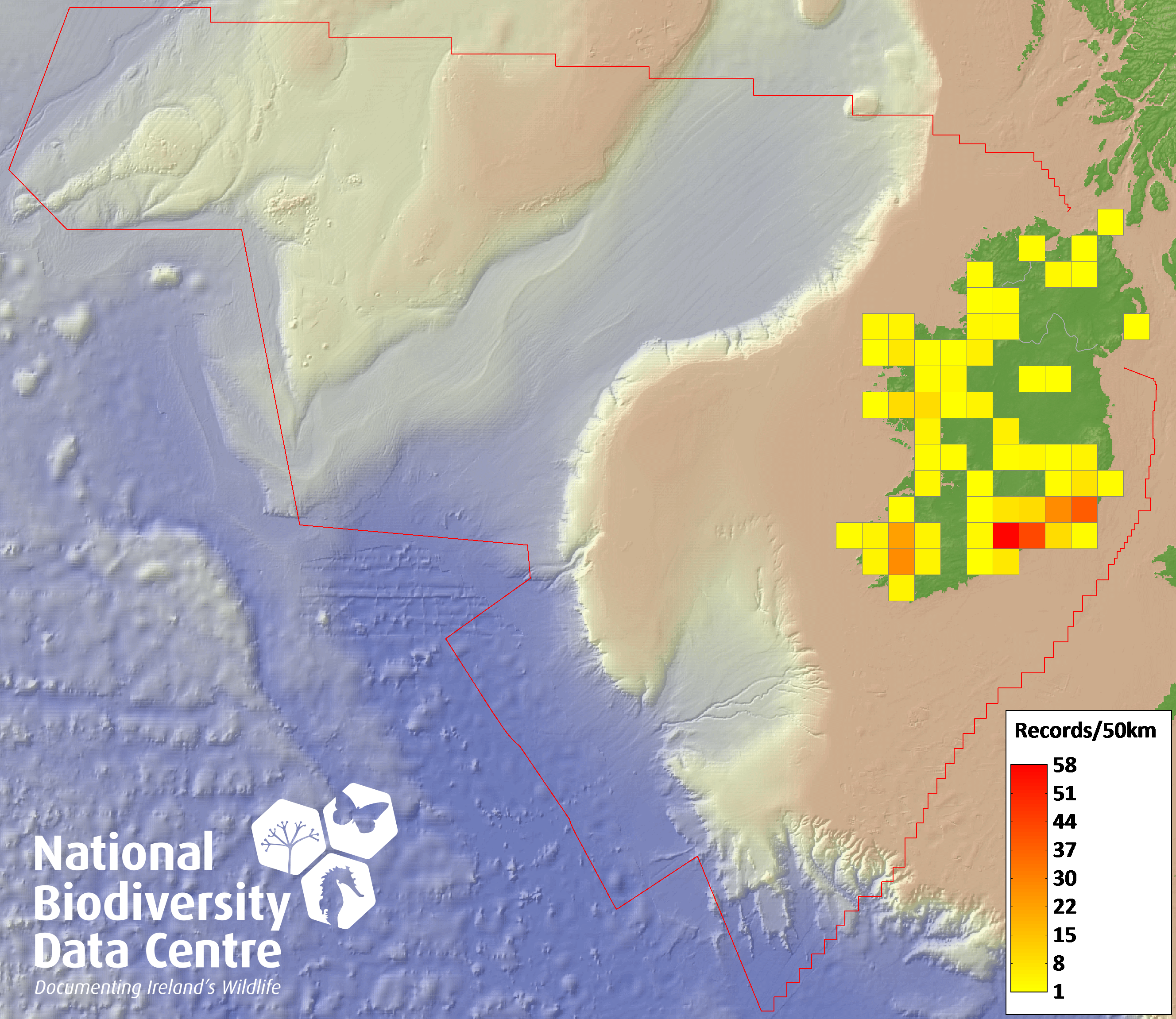 Distribution of the number of records recorded within each 10km grid square (ITM).Marine Map - 50km