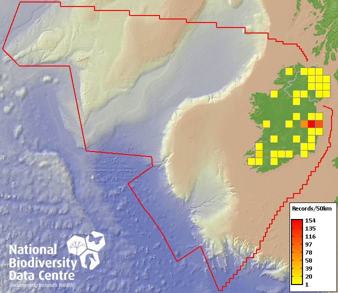 Distribution of the number of records recorded within each 10km grid square (ITM).Marine Map - 50km