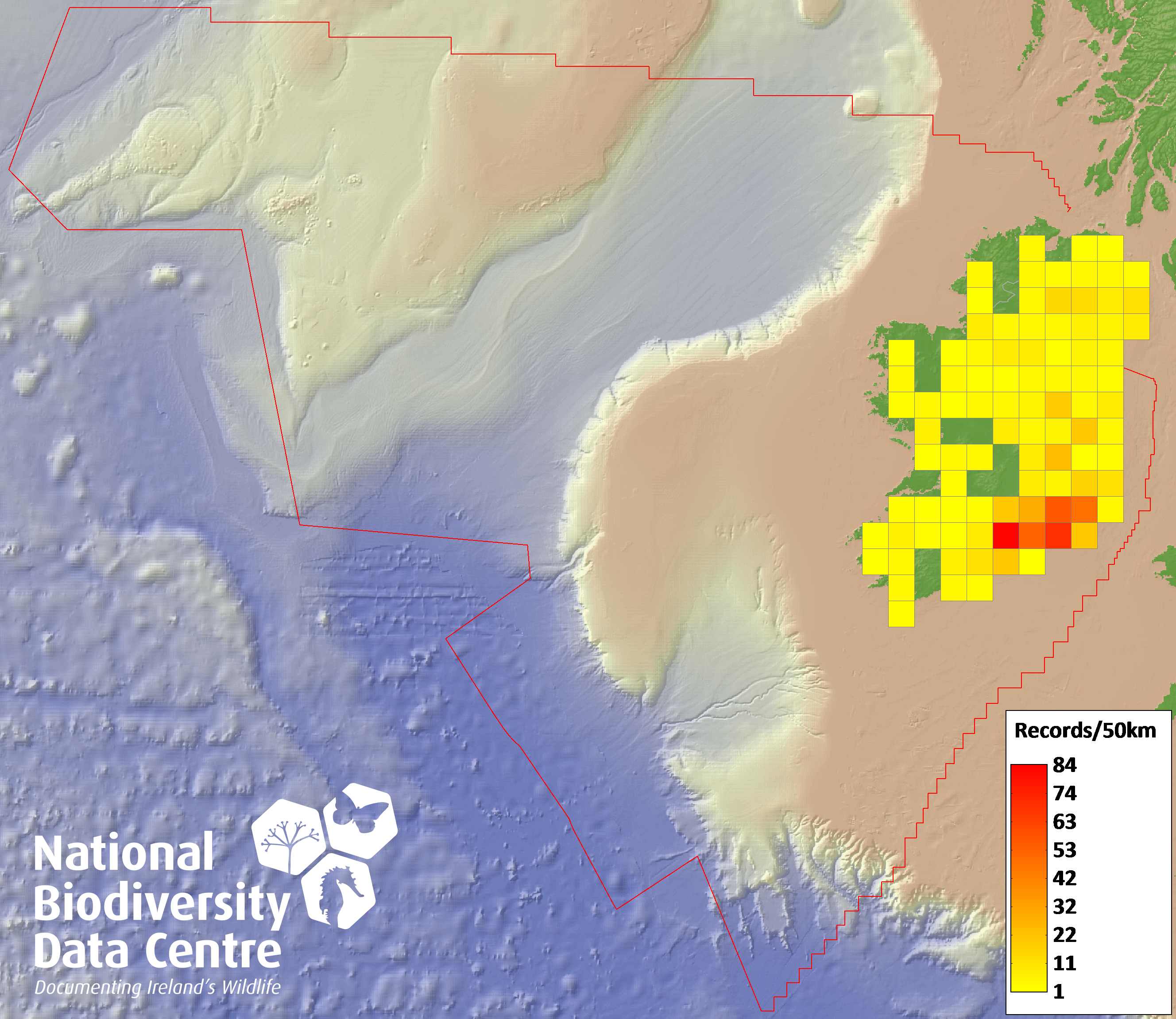 Distribution of the number of records recorded within each 10km grid square (ITM).Marine Map - 50km