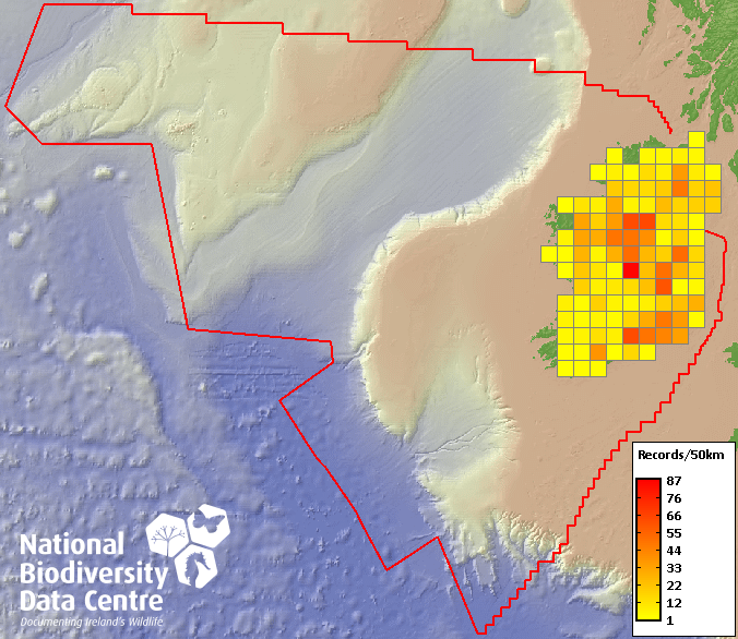 Distribution of the number of records recorded within each 10km grid square (ITM).Marine Map - 50km