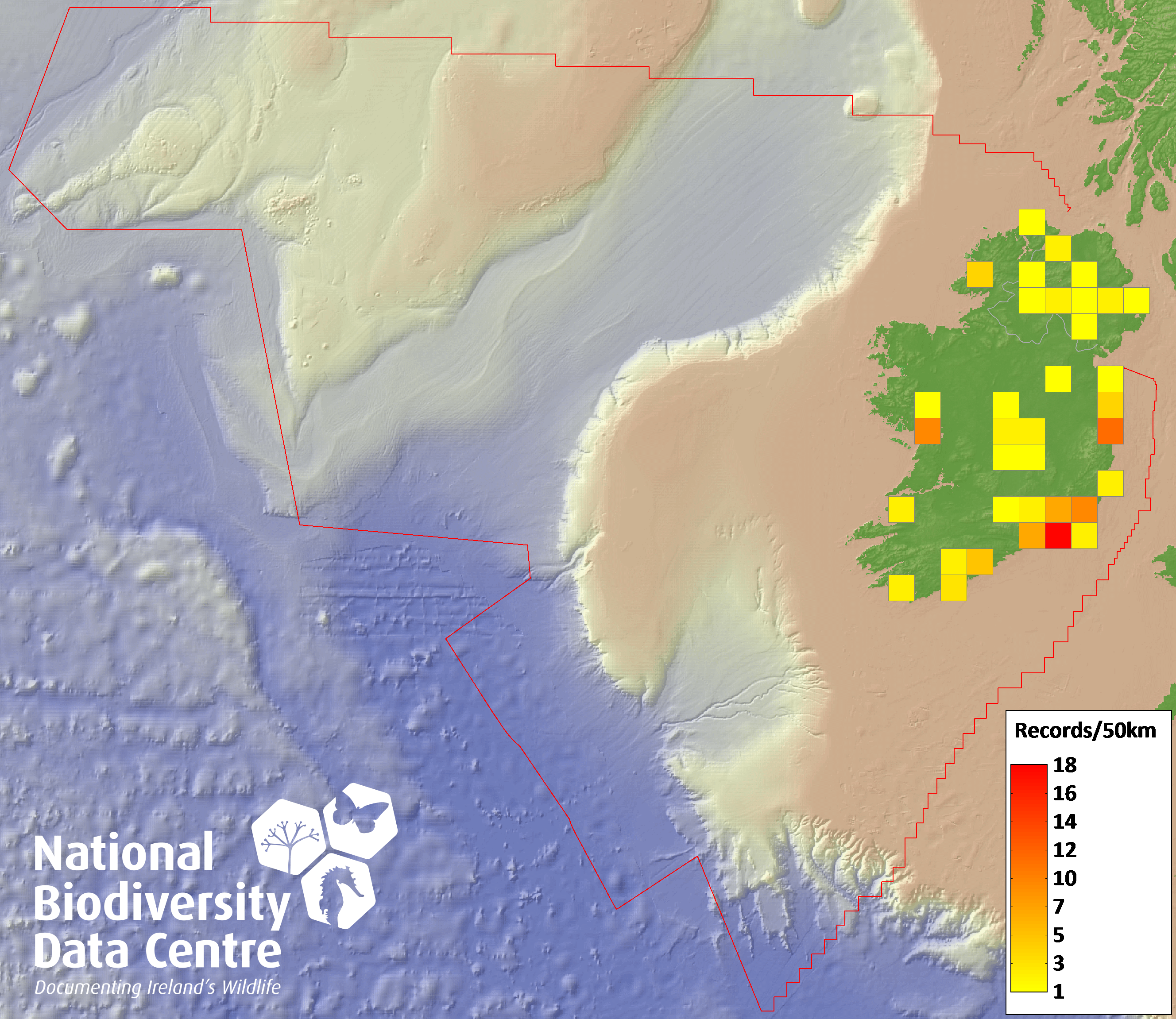 Distribution of the number of records recorded within each 10km grid square (ITM).Marine Map - 50km