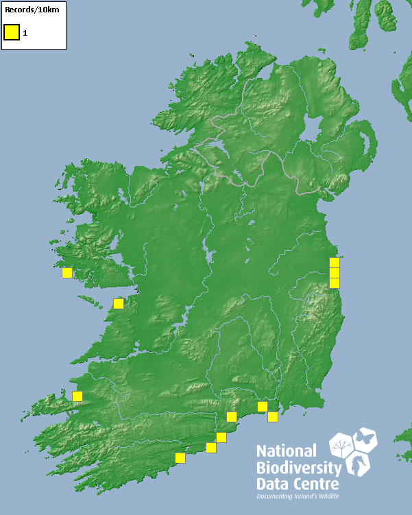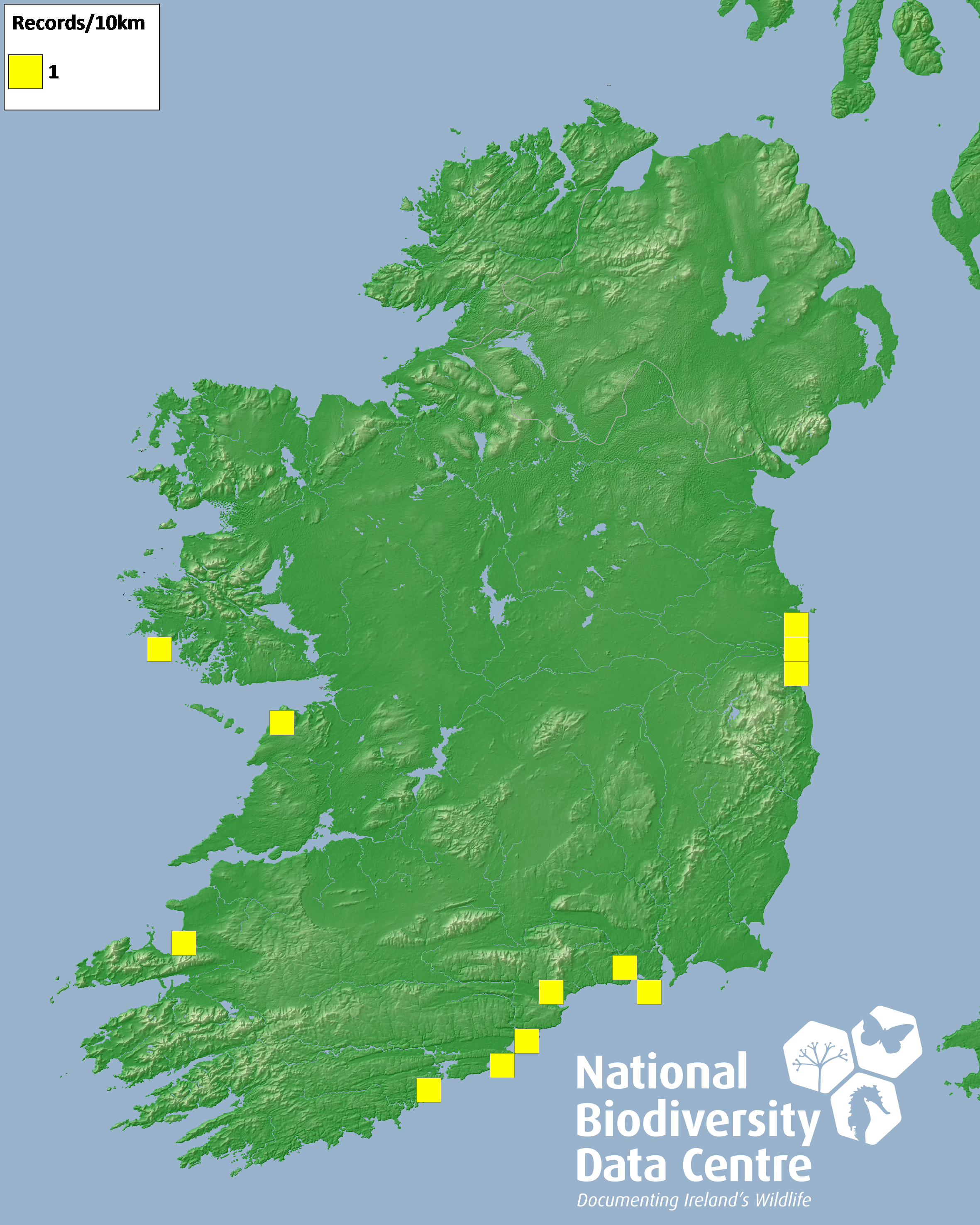 Distribution of the number of records recorded within each 10km grid square (ITM).Marine Map - 50km