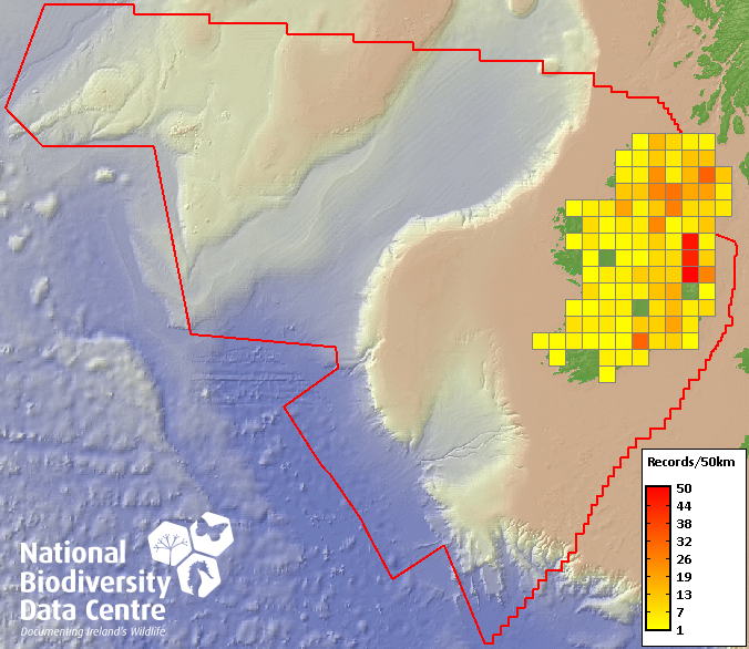 Distribution of the number of records recorded within each 10km grid square (ITM).Marine Map - 50km