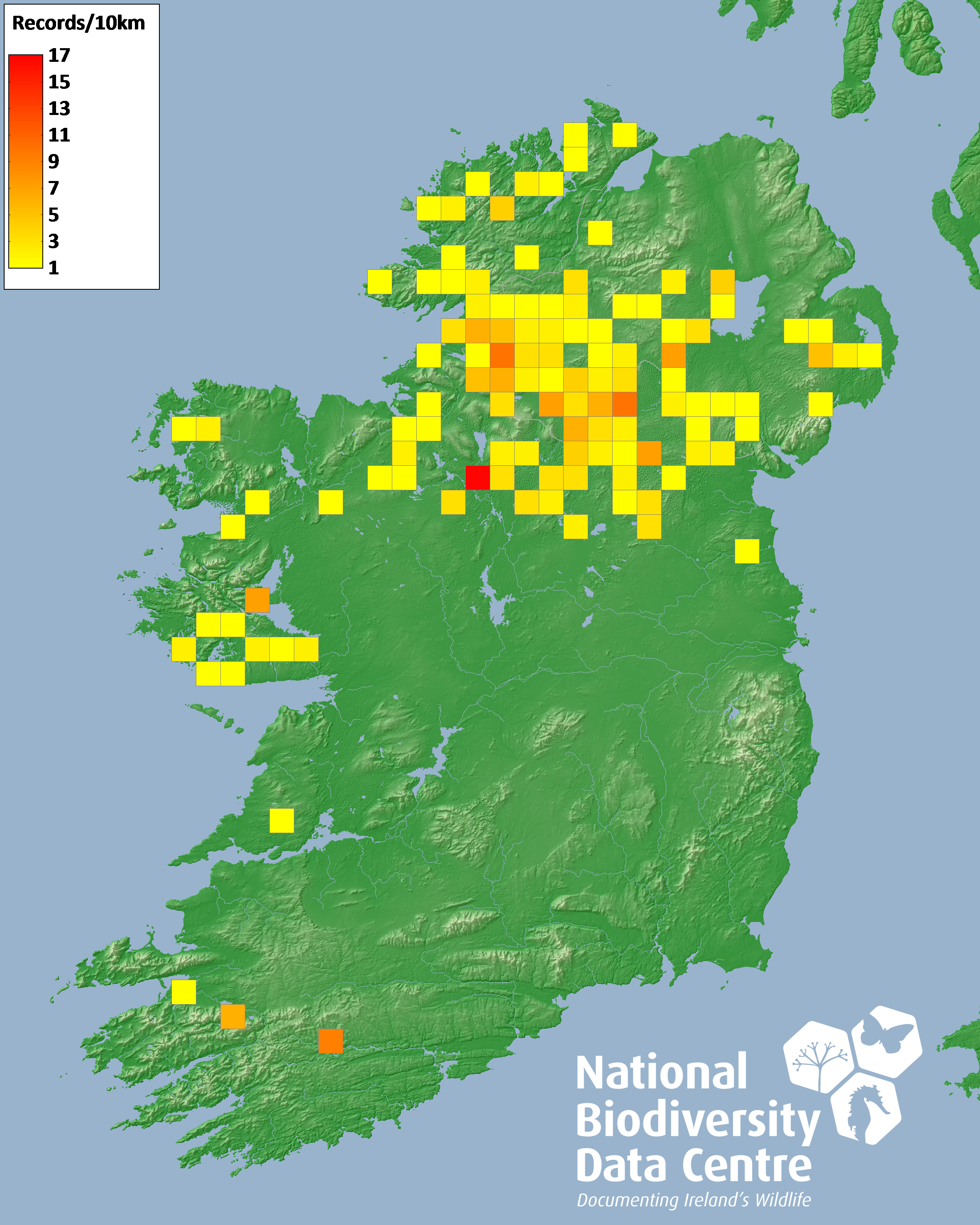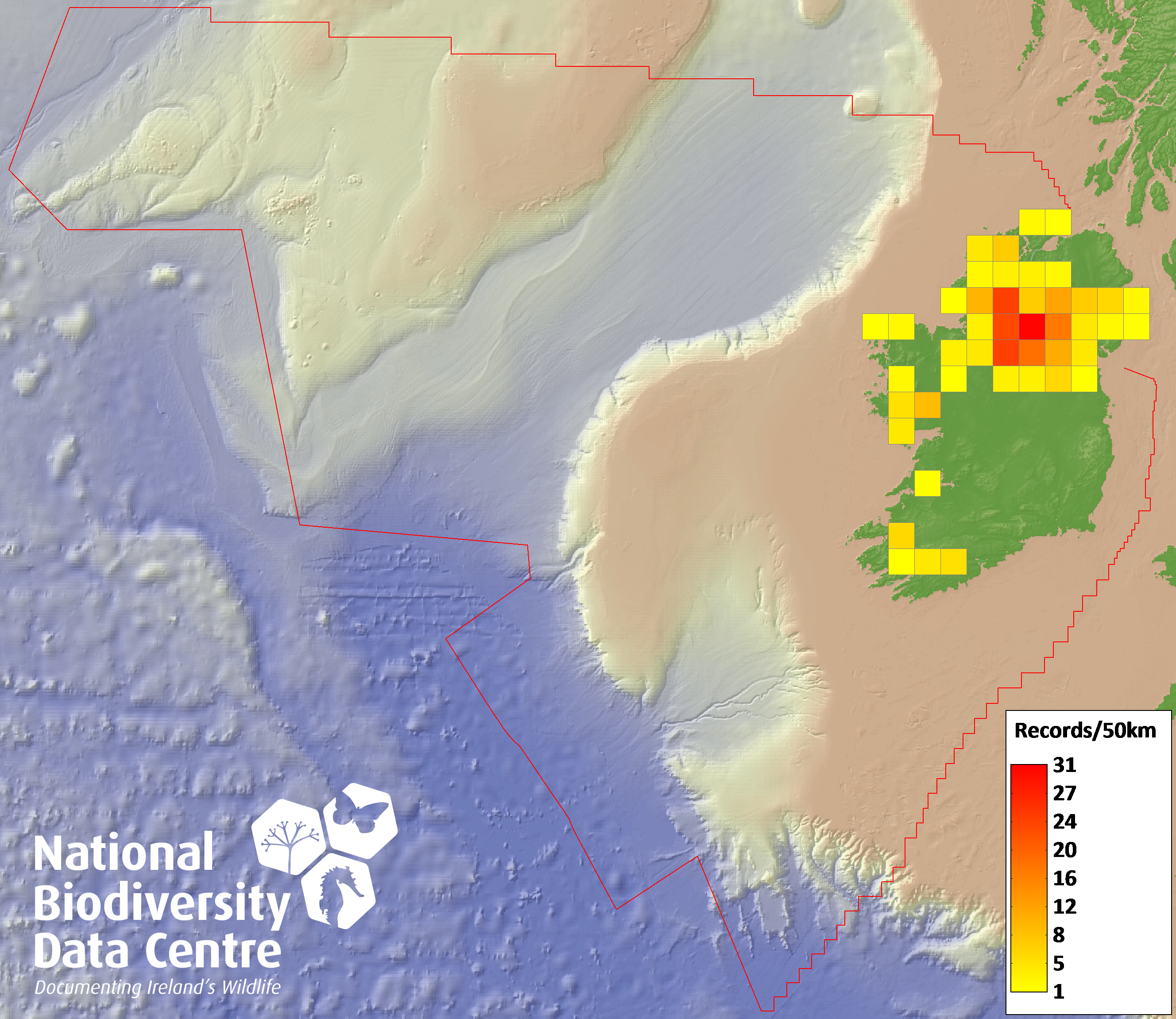 Distribution of the number of records recorded within each 10km grid square (ITM).Marine Map - 50km