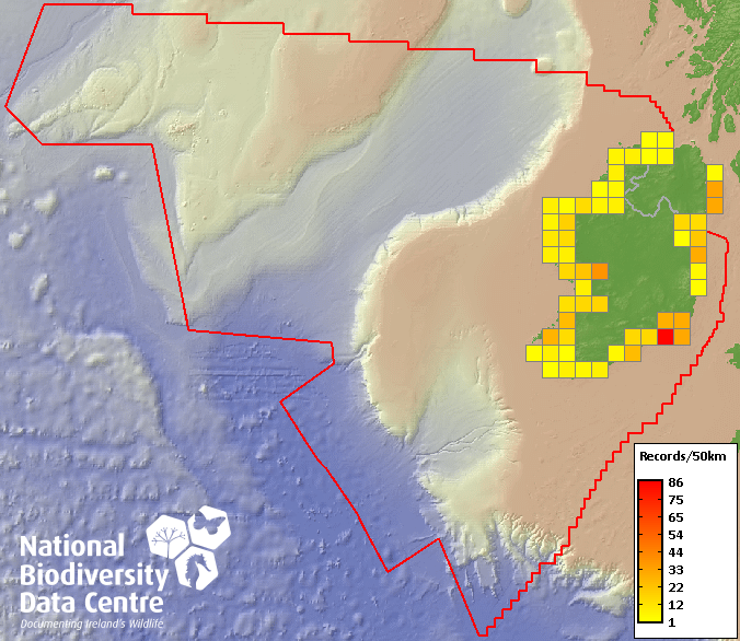Distribution of the number of records recorded within each 10km grid square (ITM).Marine Map - 50km