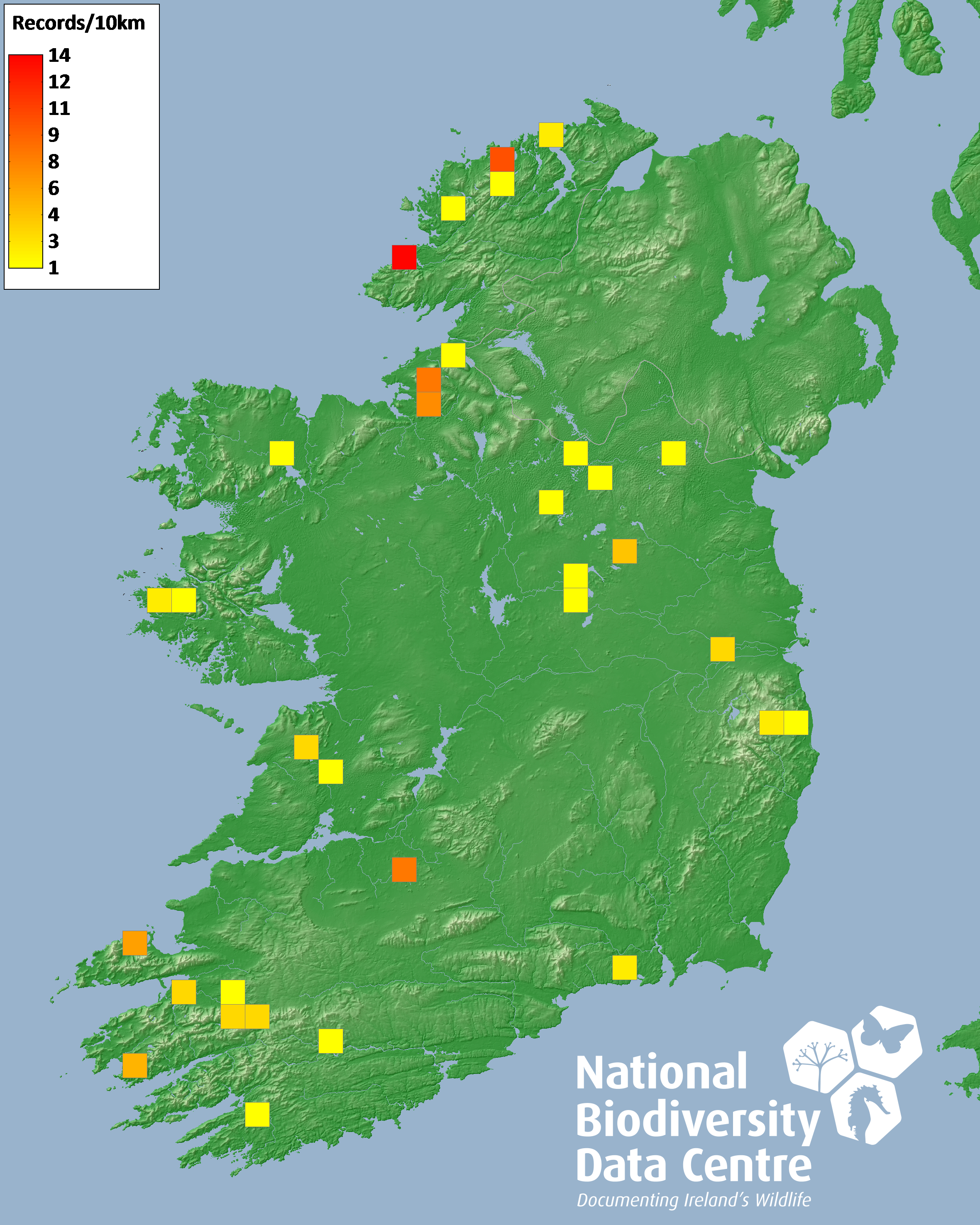 Distribution of the number of records recorded within each 10km grid square (ITM).Marine Map - 50km