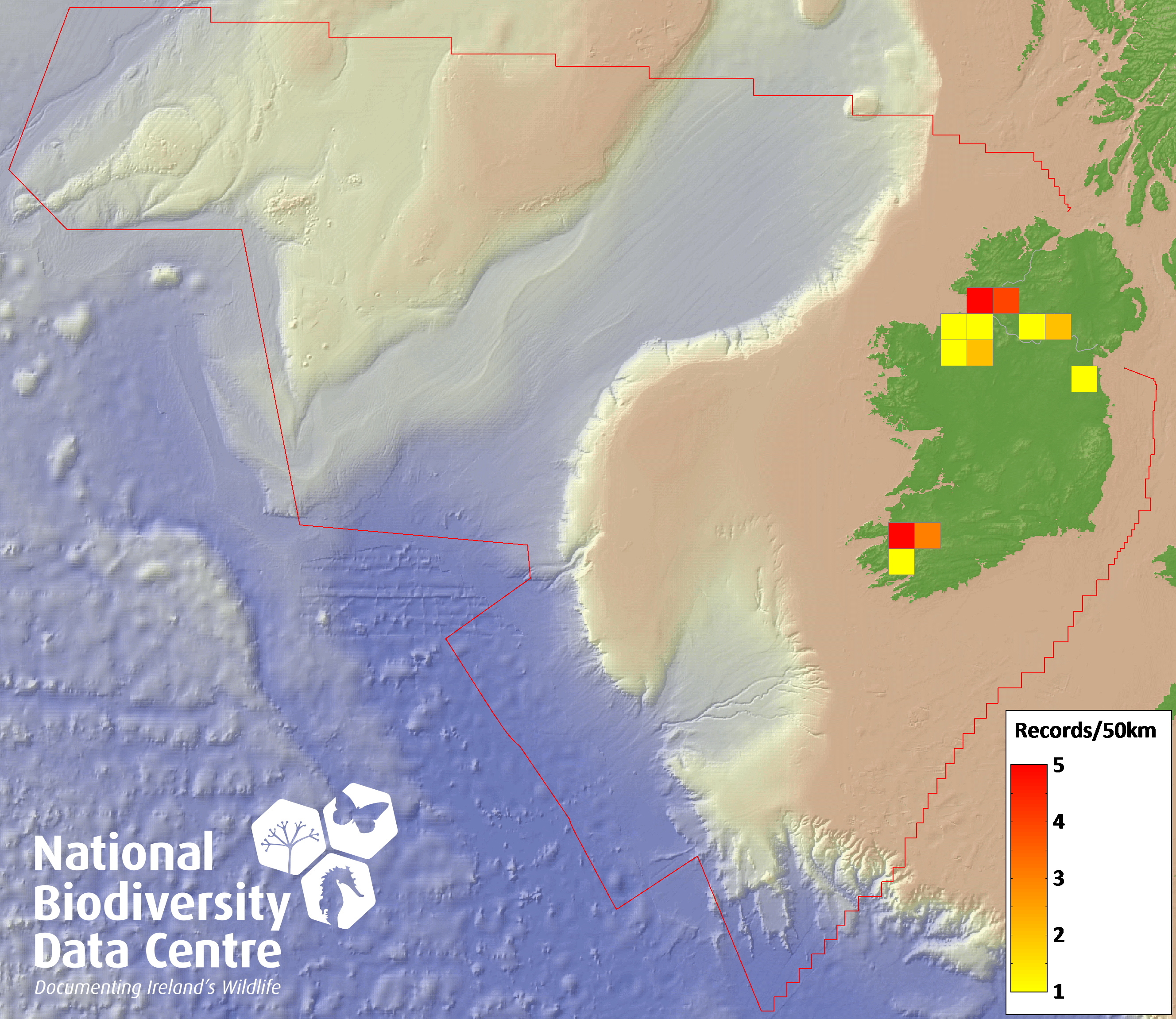 Distribution of the number of records recorded within each 10km grid square (ITM).Marine Map - 50km