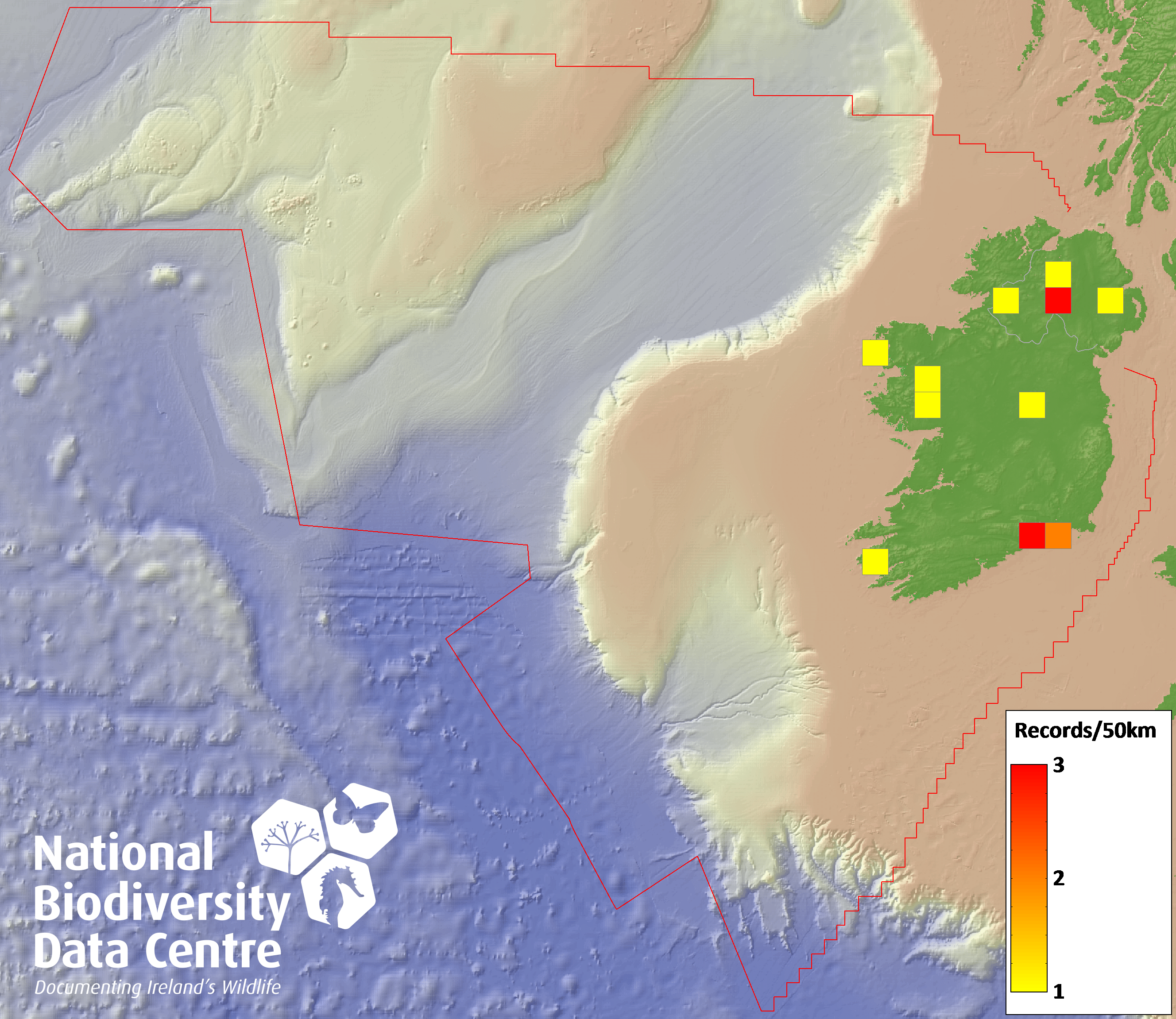 Distribution of the number of records recorded within each 10km grid square (ITM).Marine Map - 50km