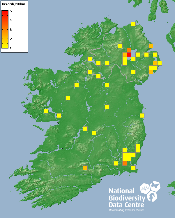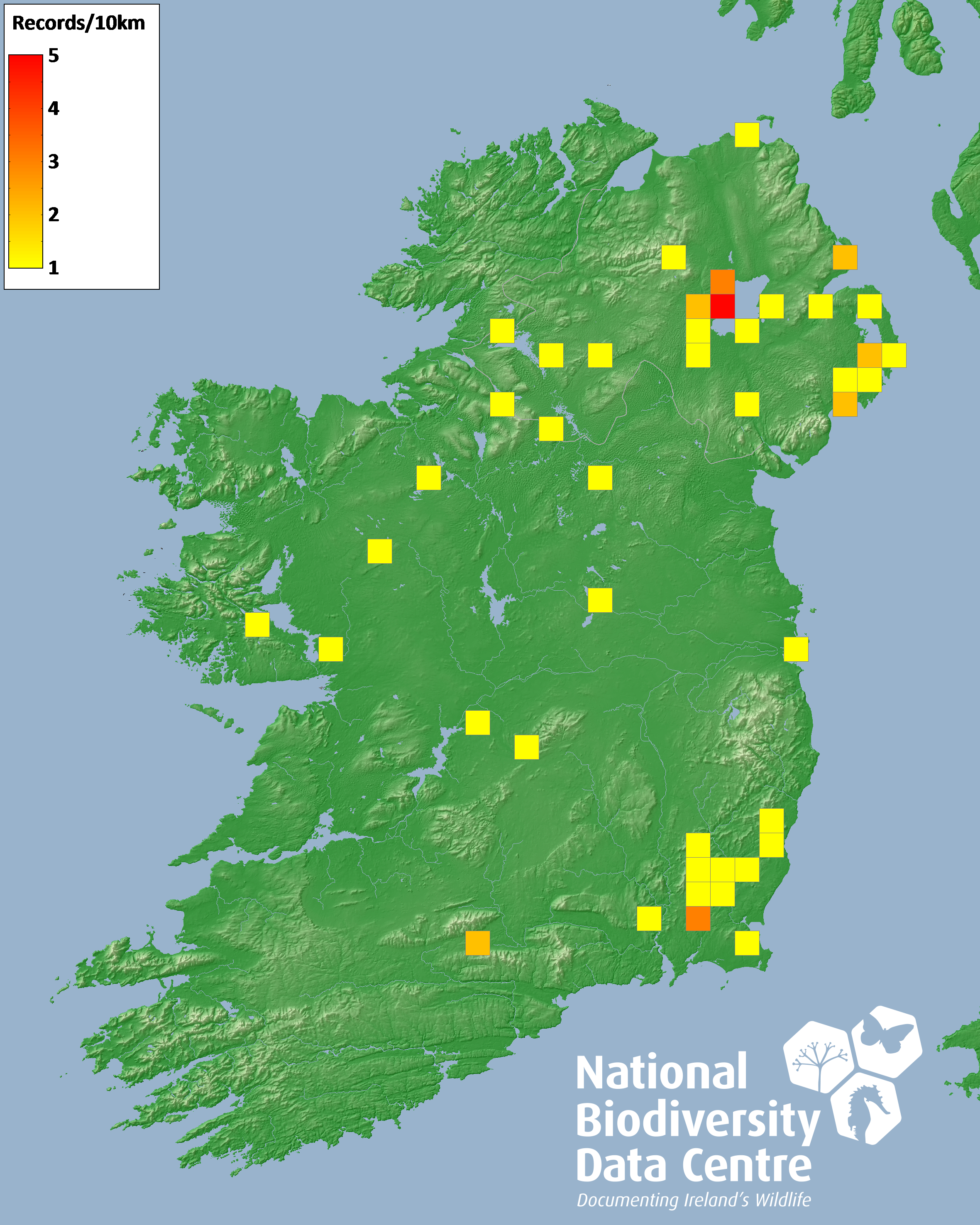 Distribution of the number of records recorded within each 10km grid square (ITM).Marine Map - 50km