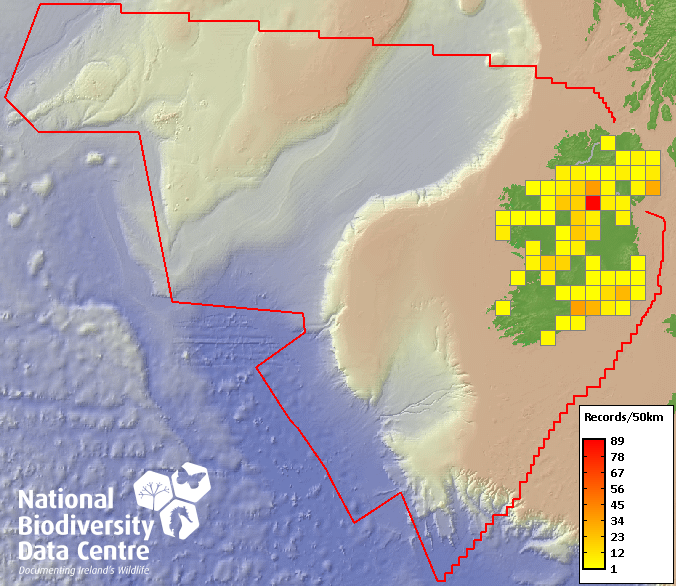 Distribution of the number of records recorded within each 10km grid square (ITM).Marine Map - 50km